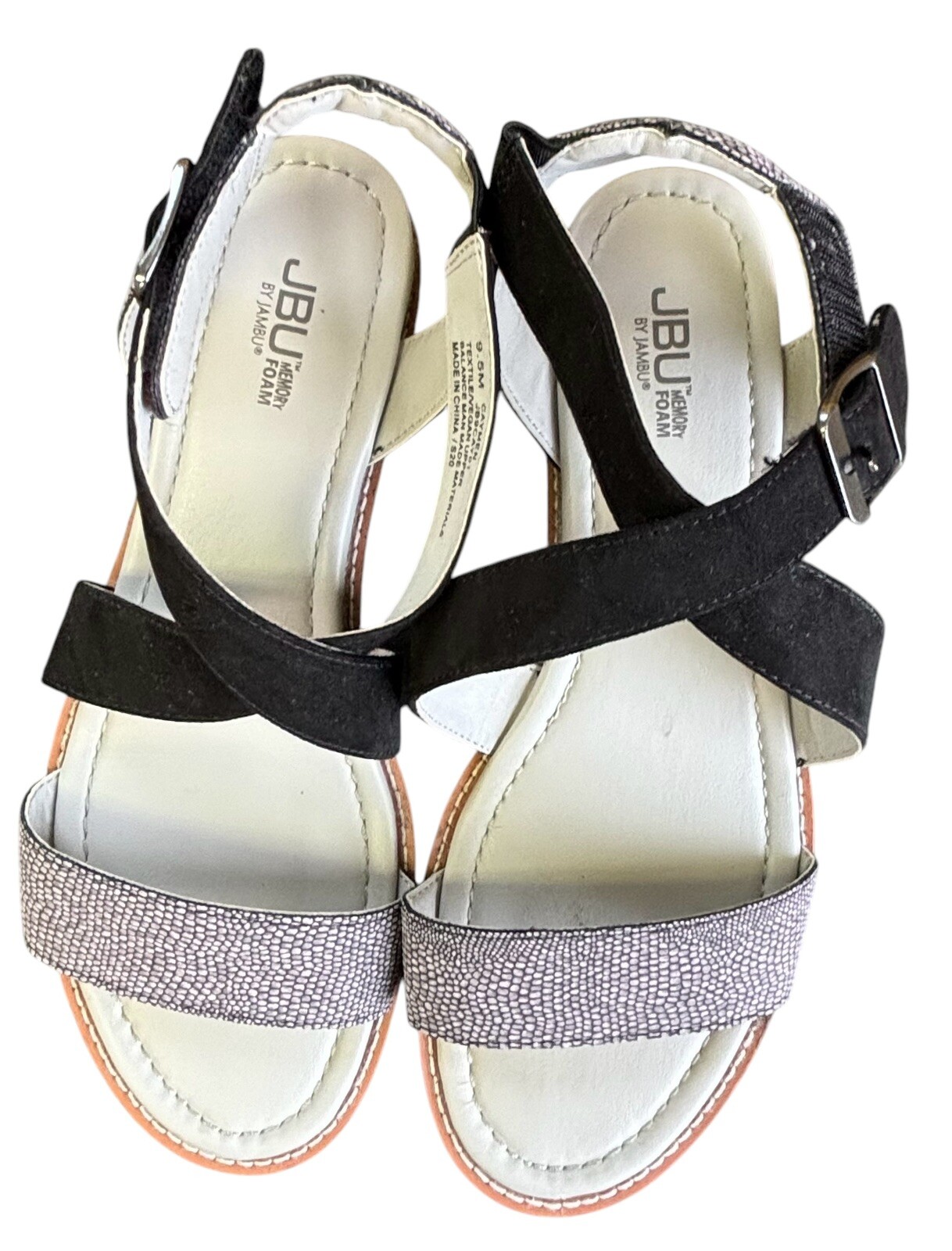 Elevate your summer style with these JBU by Jambu women's sandals in size 9.5M. The black and gray animal print pattern adds a touch of playfulness to any outfit, while the hook and loop closure ensures a secure fit. The slight wedge heel style provides comfort and the synthetic outsole material offers durability. These sandals feature adjustable straps, a vegan upper material, and faux leather insole material. The buckle accents and animal print pattern make them a trendy addition to any wardrobe. Perfect for summer, these Jambu sandals are a must-have for any woman's shoe collection. EUC