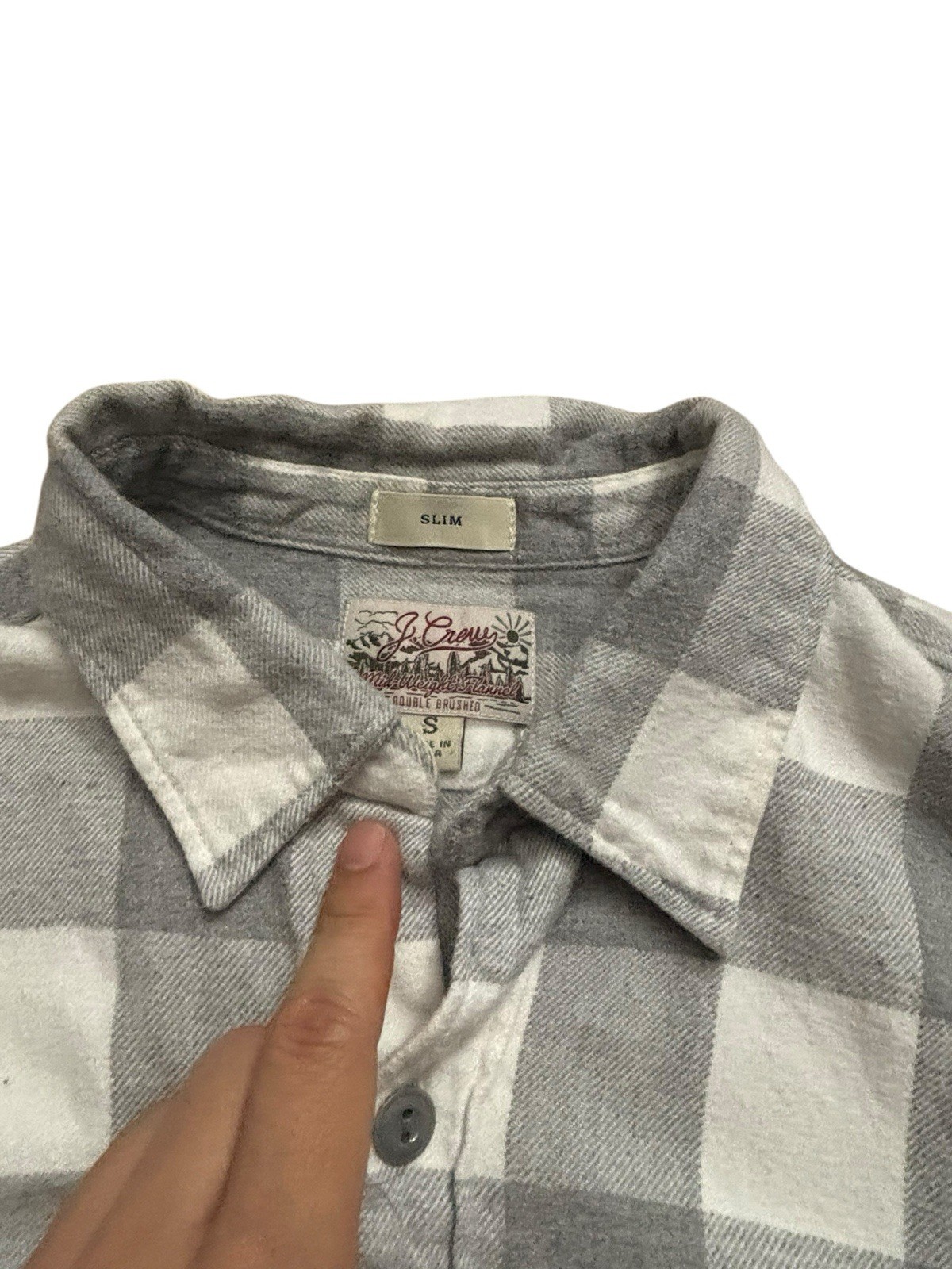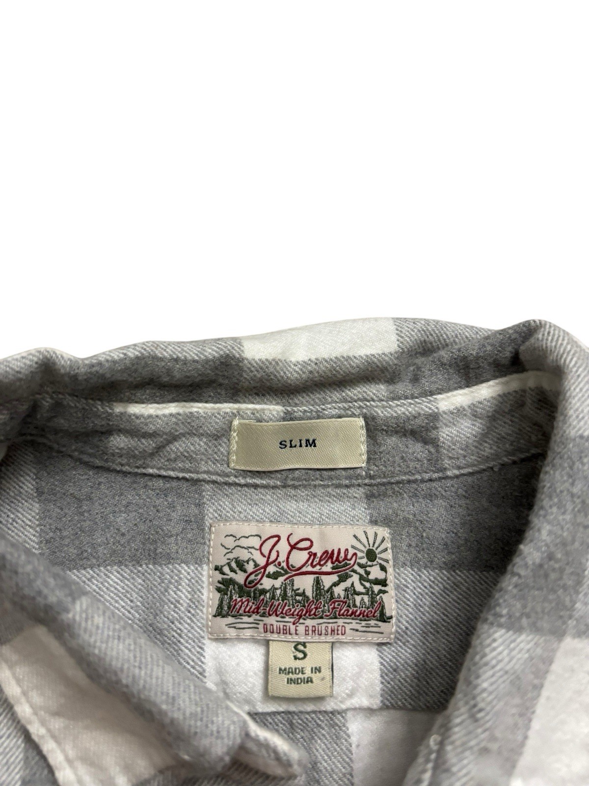 Missing collar button. This J.CREW shirt for men in size small is a versatile addition to any wardrobe. The gray plaid design with a slim fit and midweight flannel fabric makes it suitable for various occasions from casual outings to formal events. The long sleeves, button-up closure, and collared neckline add a touch of sophistication. Machine washable and made of cotton, this shirt is both stylish and easy to care for. Perfect for all seasons, this classic and modern button-up shirt is a timeless choice for any man looking for a high-quality, fashionable garment.