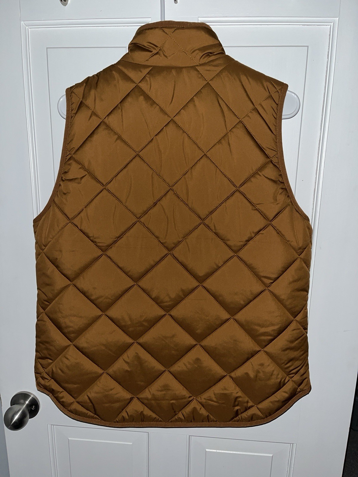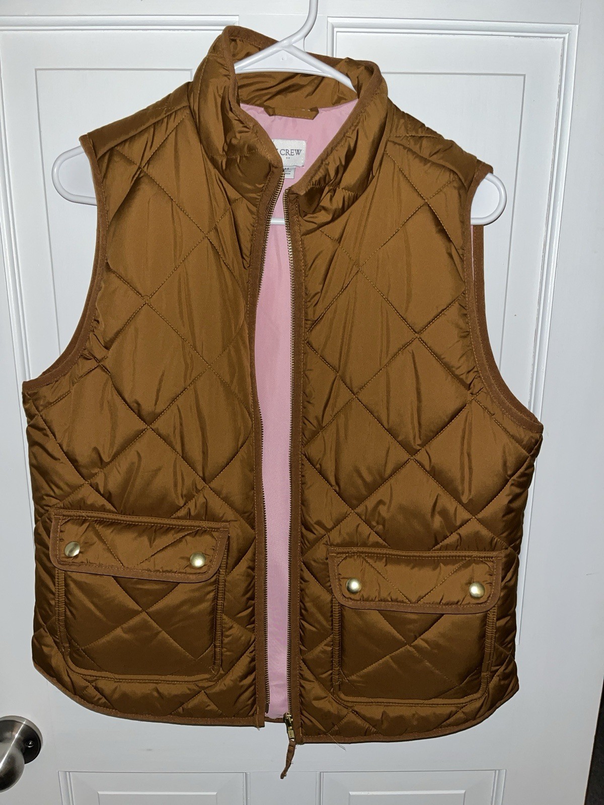 J.Crew Quilted Puffer Vest Women’s Size M Zip Front Snap Pockets Mock Neck Camel