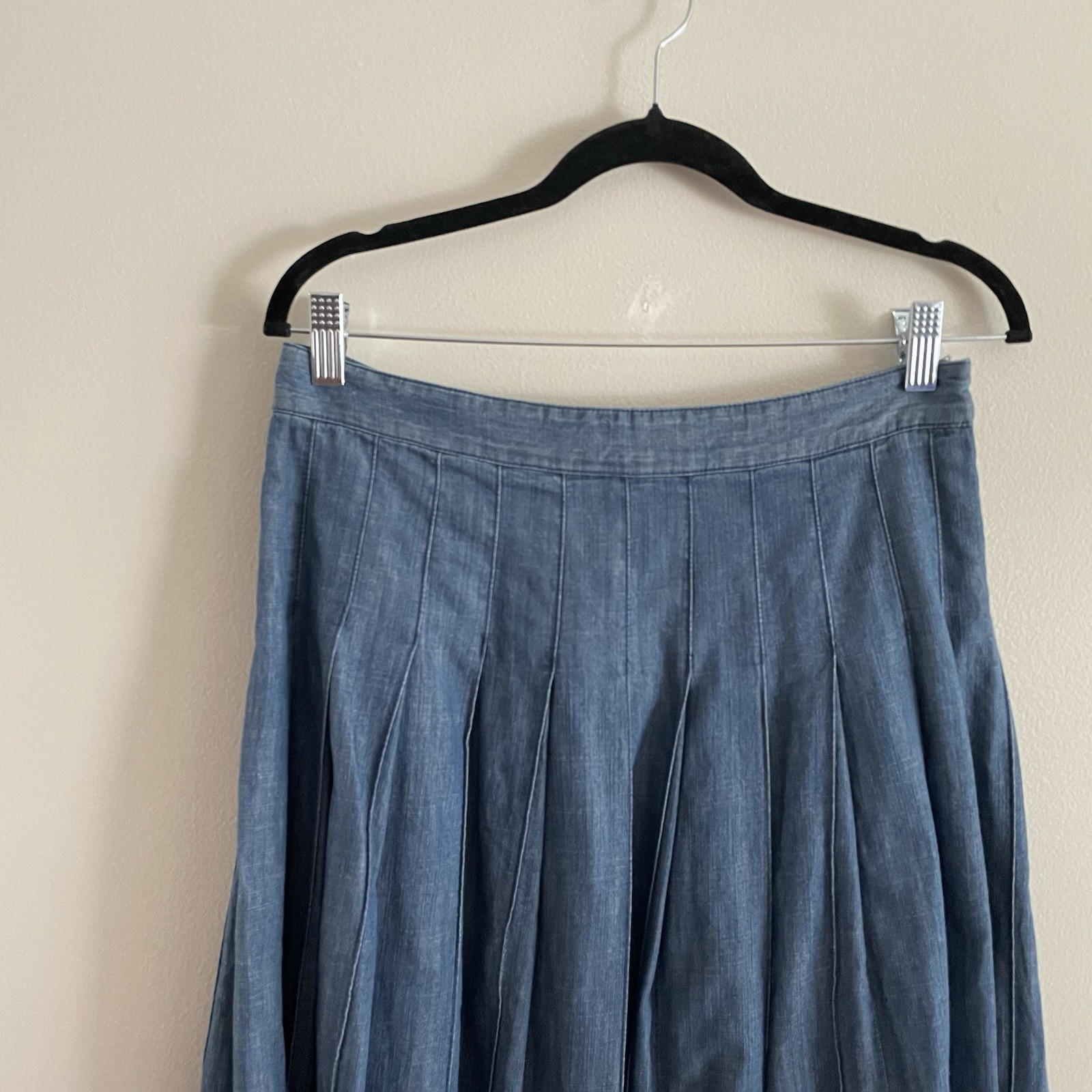 This skirt is absolutely adorable! The fit is perfect—flattering and comfortable with just the right amount of flare. The chambray fabric is soft yet structured, and the pleats add a cute preppy touch. Love that it’s new with tags and in great condition. The waist and length measurements were spot on, making it easy to order with confidence. Would definitely recommend!