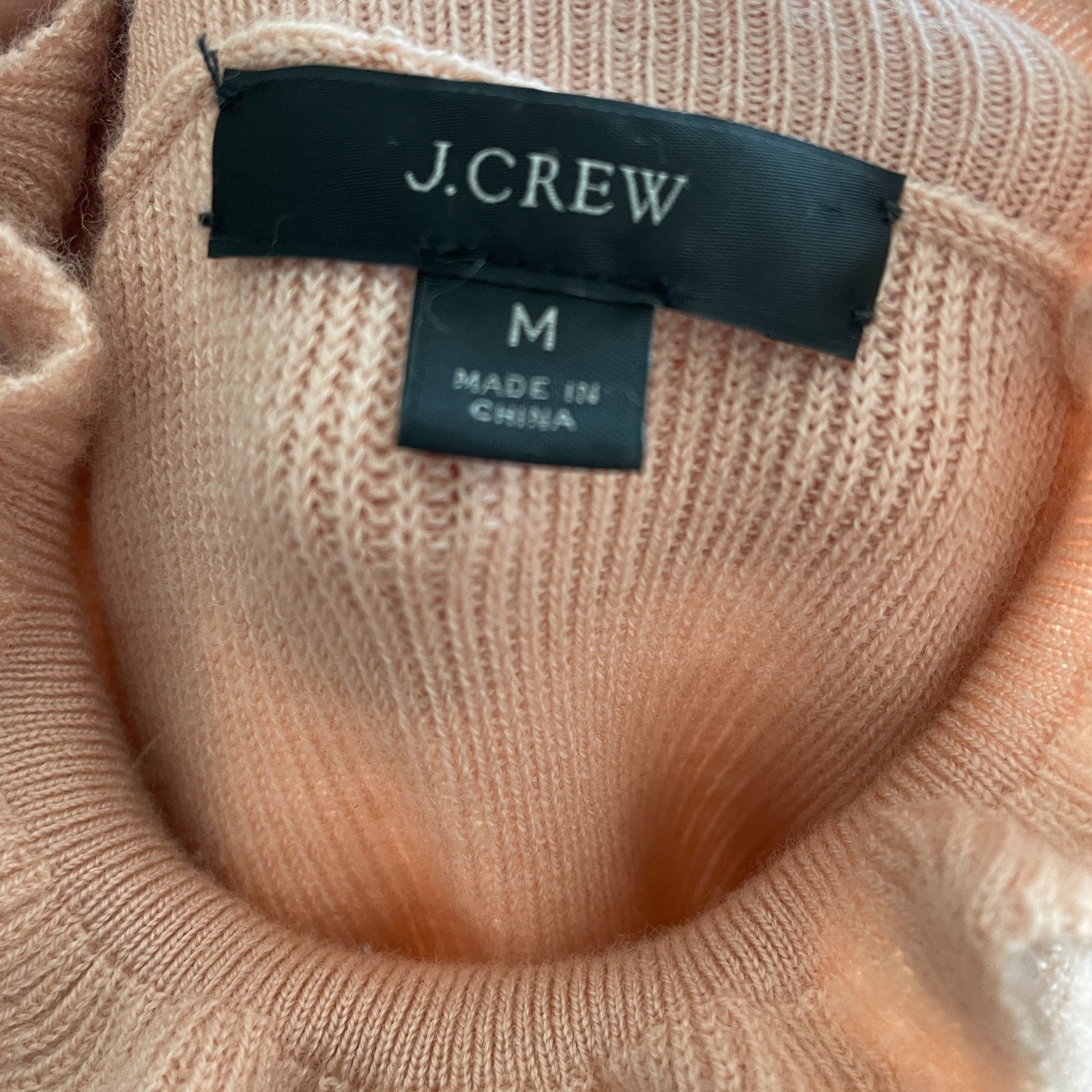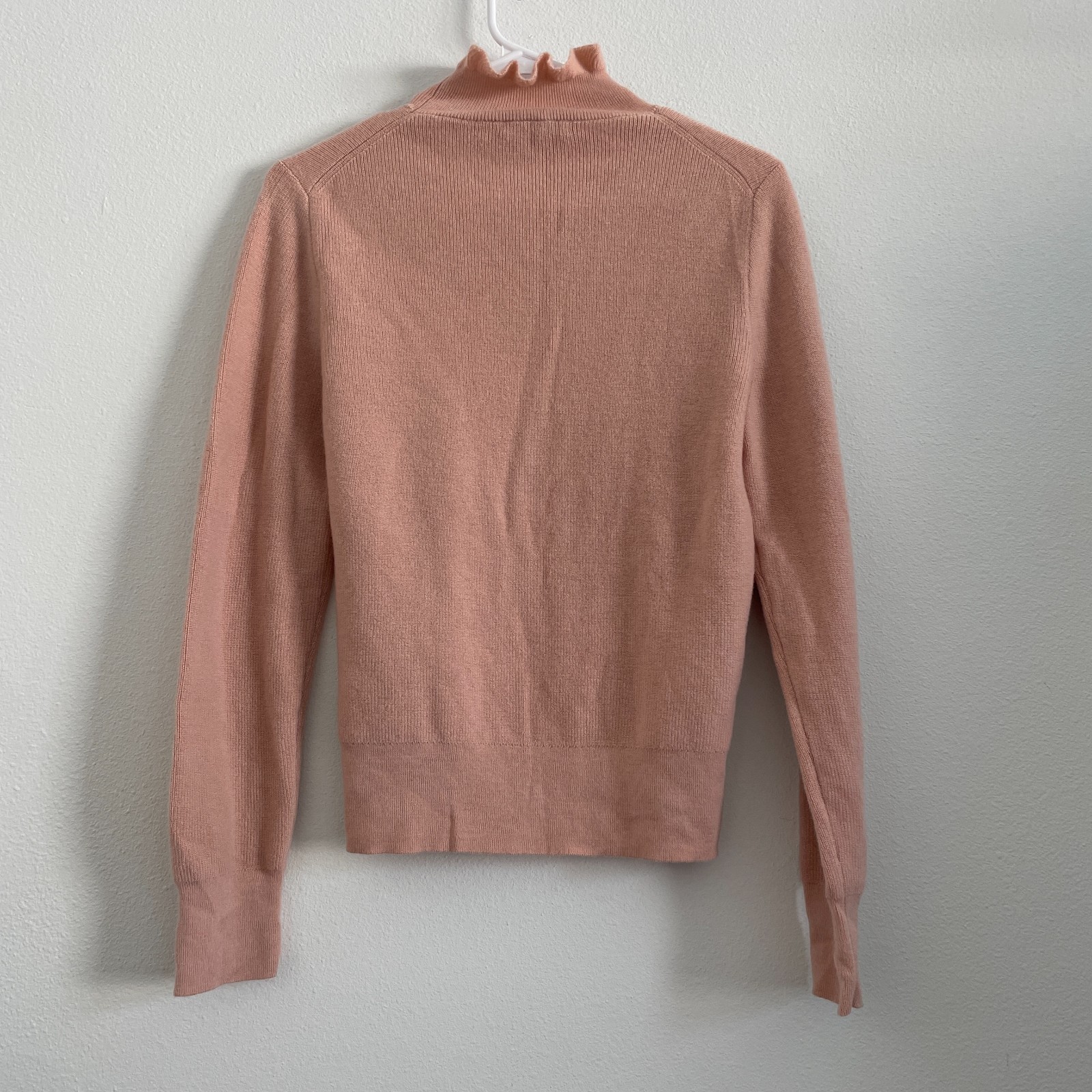 J.Crew Sweater Womens M Ruffle Turtleneck Pink Ribbed Knit Merino Wool Excellent Used Condition. This item has no rips, stains or defects. Please see photos for measurements, care tag and material tag.