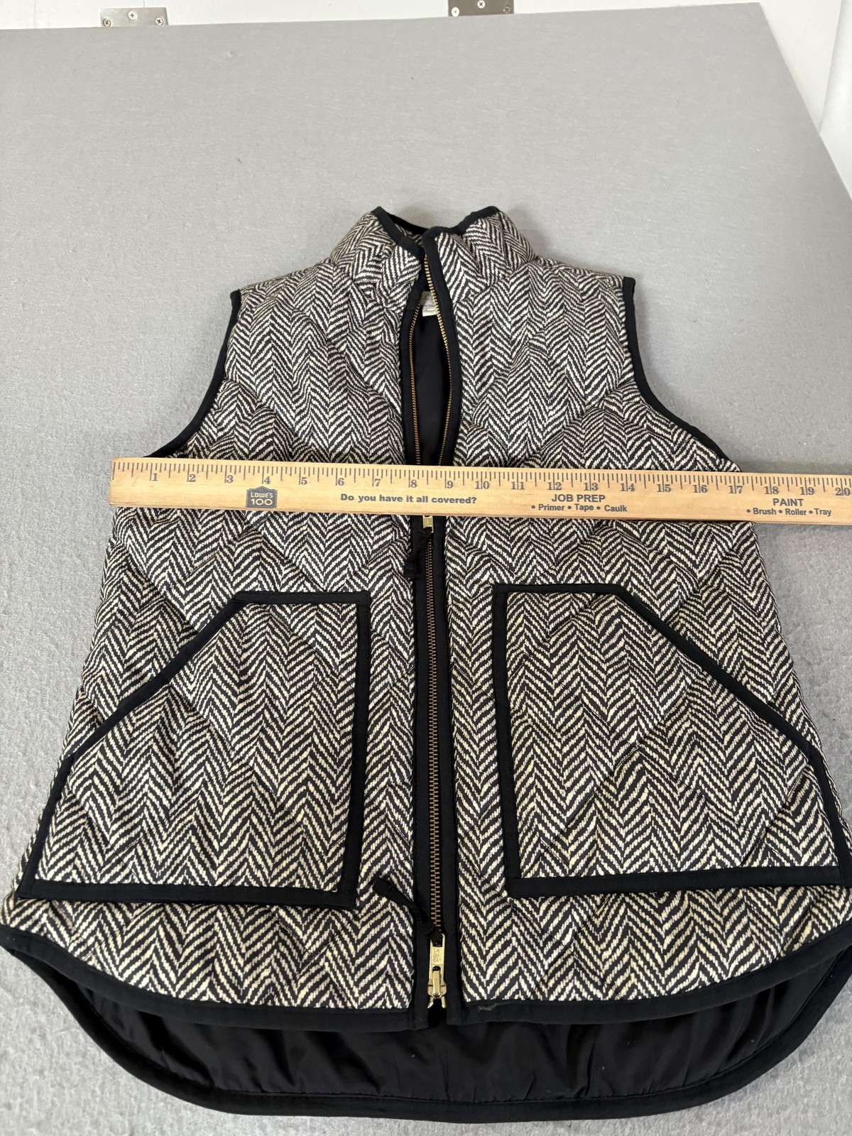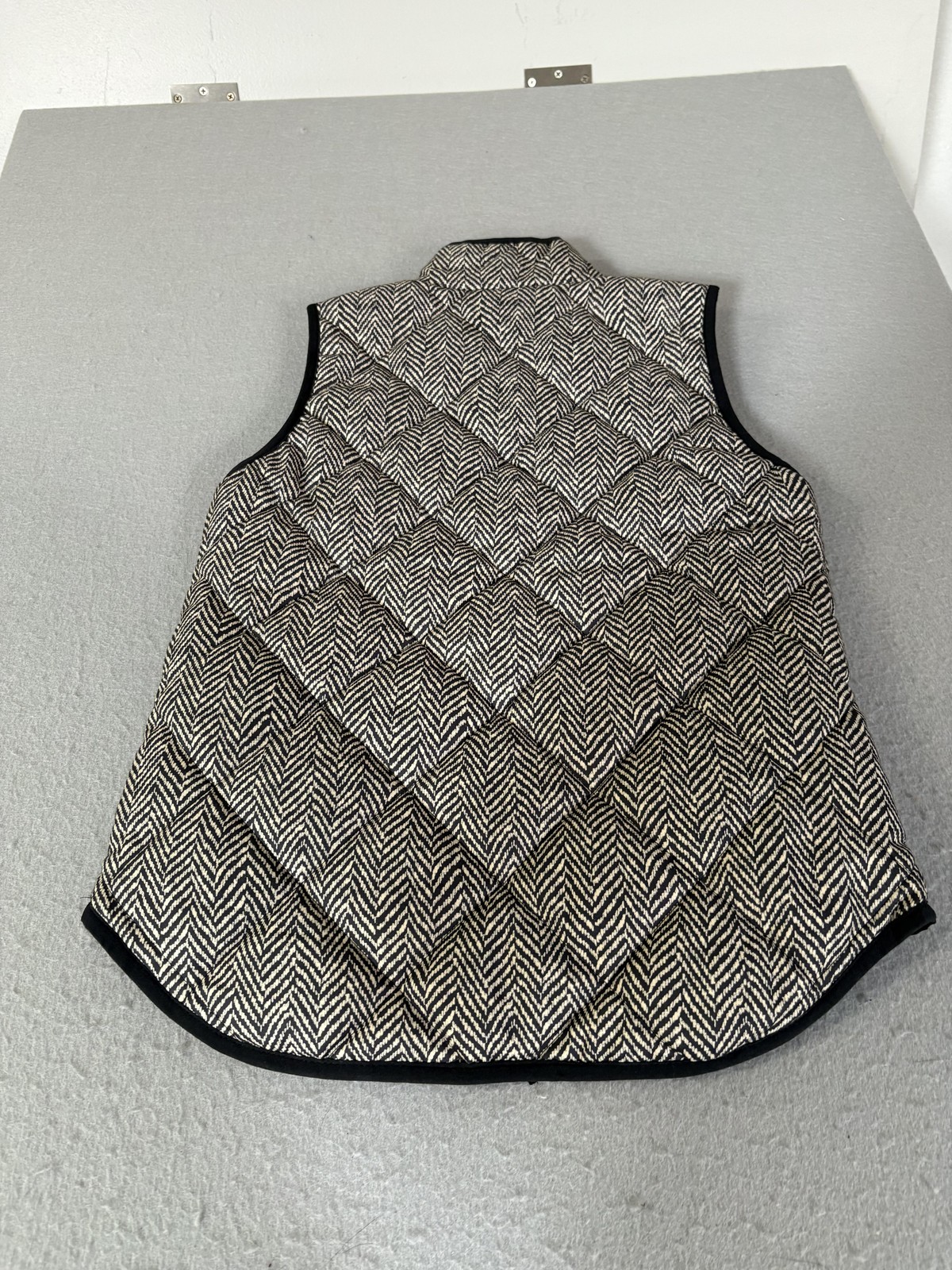 Brand: J.Crew Item: Womens quilted puffer vest in a black and white herringbone pattern with black contrast trim. Details: Two-way gold-tone front zipper, stand collar, two front patch pockets, curved drop-tail hem, fully lined. Size on tag: XS Made in Vietnam.