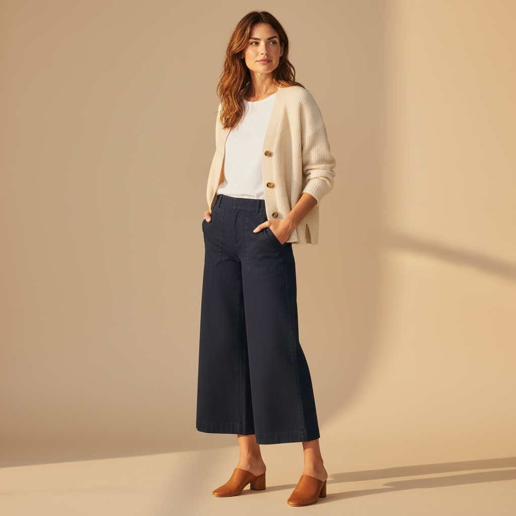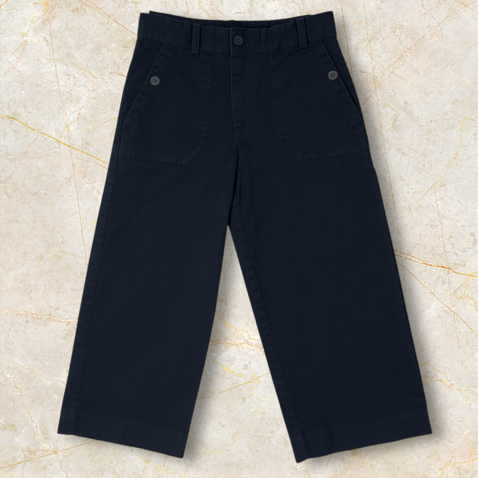 Effortless, modern, and endlessly wearable, these J.Crew Re-Imagined wide-leg crop pants offer a relaxed silhouette with a polished utility finish. Designed in a soft cotton-viscose blend with stretch , they deliver all-day comfort while maintaining a clean, structured drape. Featuring front utility pockets, belt loops, and a cropped wide-leg cut , these pants pair easily with casual tees and elevated knits alike. Finished in classic black, they’re a versatile wardrobe staple perfect for work-to-weekend styling. Made in a Fair Trade Certified factory from J.Crew’s sustainable “Re-Imagined” program—thoughtfully produced with environmental responsibility in mind. Details & Features Brand: J.Crew Size: 10 Color: Black Fit: Cropped wide leg Utility front pockets Belt loops Cotton/viscose/elastane stretch blend (52% cotton / 41% viscose / 7% elastane) Fair Trade Certified factory Re-Imagined by J.Crew collection Machine washable Season indicator on tag: SP22 Measurements (Laid Flat): Waist: ~15" Hips: ~19" Rise: ~11" Thigh: ~12" Inseam: ~23.5 Length: ~33" Leg opening: ~11.5" Why You'll Love Them These are the kind of elevated basics that instantly look styled without trying— wide-leg fit, modern cropped silhouette, Fair-Trade production, and comfortable stretch cotton. Perfectly versatile for minimalist styling, travel, casual office dressing, and year-round capsule wardrobes.