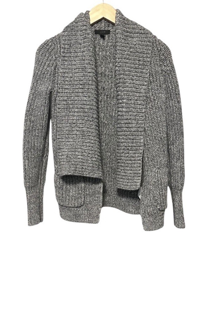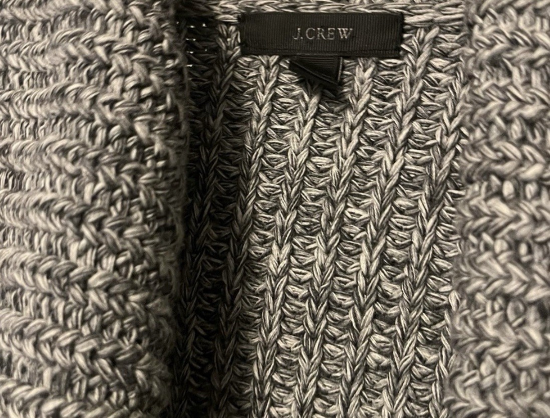 This J.Crew Women's Marled Grey Rib Stitch Shawl Collar Cardigan Sweater in size S is a stylish and versatile piece for any woman's wardrobe. Made from comfortable cotton material, it features a classic shawl collar and a marled grey color that adds a touch of texture. The rib stitch detail gives it a unique look, while the cardigan style makes it easy to layer over any outfit. Perfect for everyday wear or dressing up for a special occasion, this sweater is a timeless and chic addition to any collection.