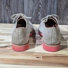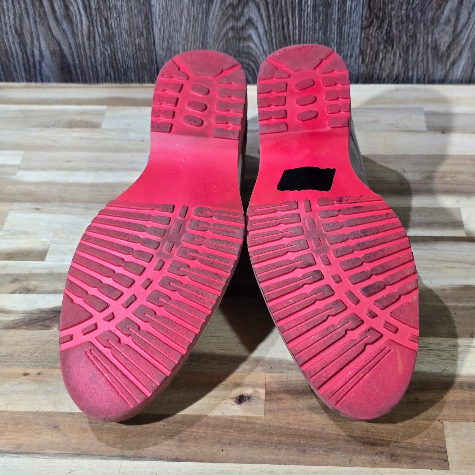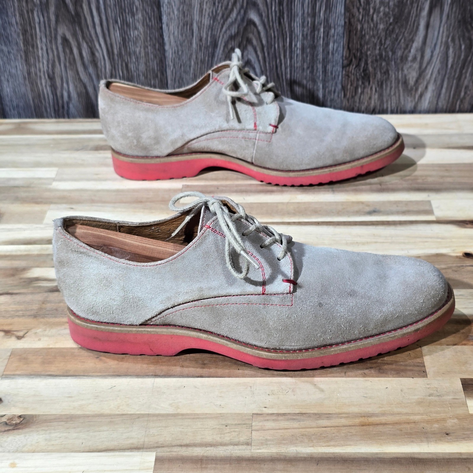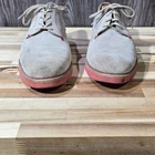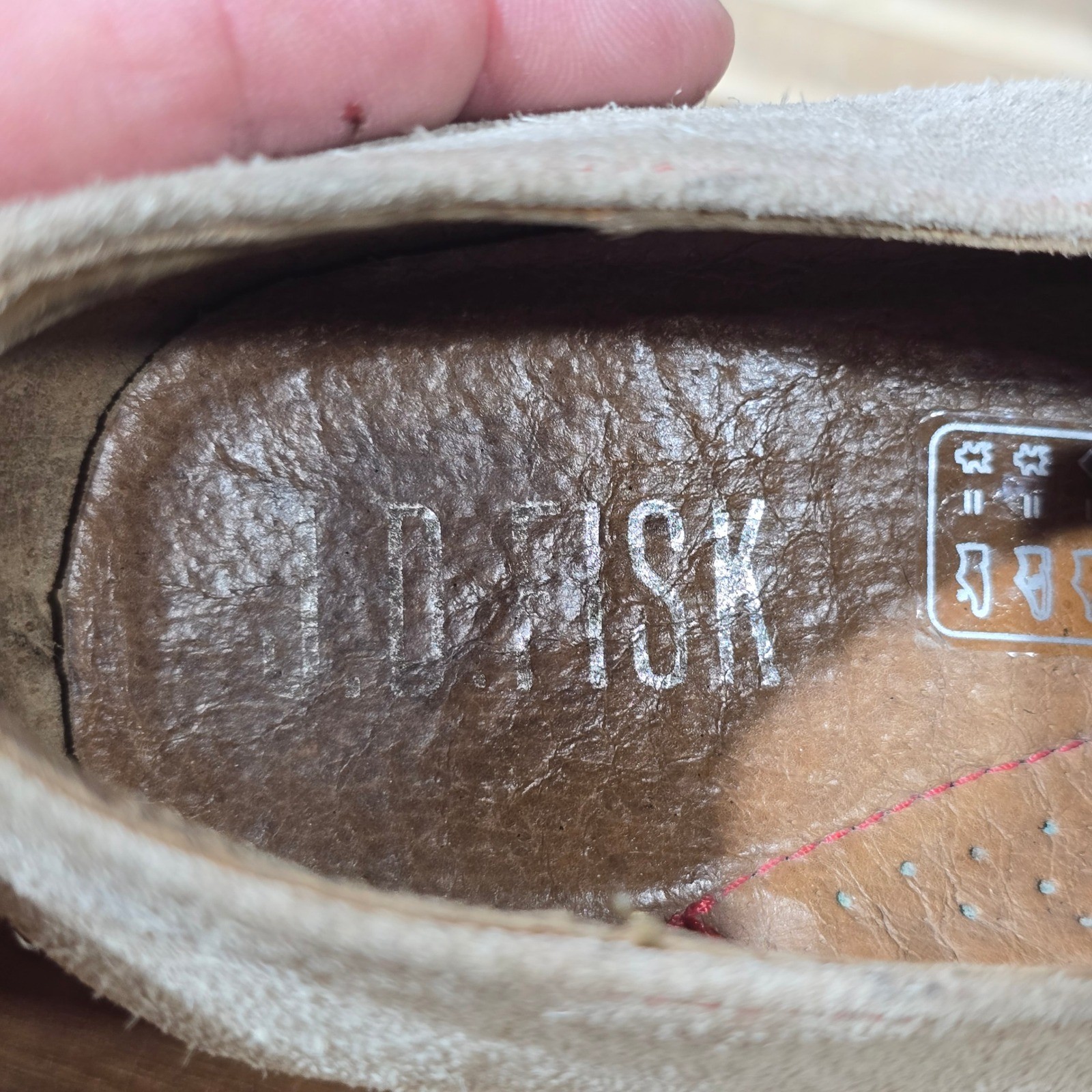 Brand: J.D. Fisk Condition: Pre-owned/Used, good tread Size: US Men's 8.5 Color: Tan Suede with Red Accents Style: Buck Oxford, Derby, Casual, Red Outsole, Contrast Stitch Step out in these stylish J.D. Fisk suede oxford shoes, perfect for a modern, casual look. They feature a classic buck silhouette with a clean tan suede upper, highlighted by bold red contrast stitching along the seams and around the welt. The most striking and unique detail is the solid, bright red rubber outsole, providing excellent traction and a distinctive fashion statement. GOOD PRE-OWNED CONDITION. The interior leather insole is worn but intact, showing the J.D. Fisk logo. The bright red rubber outsoles show moderate wear and scuffing from use, but the aggressive tread pattern remains in good condition with no major damage or uneven wear. The red color on the outsole is still vibrant.
