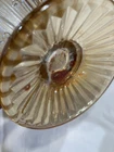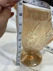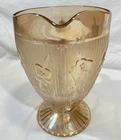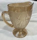 Vintage Jeannette Glass Iris & Herringbone Pitcher in orange color with a herringbone pattern. Made in the 1950s in the United States, this 56 oz pitcher features an Art Deco style and carnival glass production technique. The glossy finish adds to its decorative appeal, making it a unique American collectible. Remember to hand wash this original piece to preserve its authenticity.