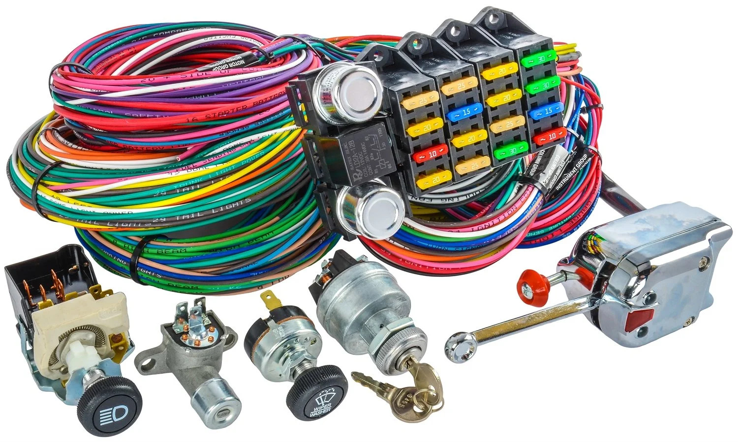 Universal Wiring Harness & Switch Kit with Woven Braid Chassis Kit20 CircuitIncludes:Wiring HarnessDimmer SwitchHeadlight SwitchWindshield Wiper SwitchTurn Signal SwitchWoven Braid Chassis Kit Wiring for:HornRadioPower WindowsPower Door LocksLights (Headlights, Taillights, Parking Lights, Dome Light, Brake Lights, 3rd Brake Light, Gauge Lights, Backup Lights, and License Plate Light)Turn Signals, Hazard Lights, and High-Beam IndicatorsWindshield WipersA/C and HeaterCharging SystemIgnition System/Coil/StarterNeutral Safety SwitchGauges (Fuel Level, Oil Pressure, Speedometer, Tachometer, Voltmeter, and Water JEGS 10405K2 Universal Wiring Harness & Switch Kit with Woven Braid Chassis Kit Universal Wiring Harness & Switch Kit with Woven Braid Chassis Kit 20 Circuit Includes: Wiring Harness Dimmer Switch Headlight Switch Windshield Wiper Switch Turn Signal Switch Woven Braid Chassis Kit Wiring for: Horn Radio Power Windows Power Door Locks Lights (Headlights, Taillights, Parking Lights, Dome Light, Brake Lights, 3rd Brake Light, Gauge Lights, Backup Lights, and License Plate Light) Turn Signals, Hazard Lights, and High-Beam Indicators Windshield Wipers A/C and Heater Charging System Ignition System/Coil/Starter Neutral Safety Switch Gauges (Fuel Level, Oil Pressure, Speedometer, Tachometer, Voltmeter, and Water Temperature) Electric Cooling Fan Electric Fuel Pump Cigarette Lighter Firewall Grommet Cable Ties Crimp Terminals Wiring Harness Easy Kit Includes: Woven Braid Chassis Kit 555-10659 Wiring Harness 555-10405 Dimmer Switch 555-11125 Headlight Switch 555-11110 Windshield Wiper Switch 555-11115 Turn Signal Switch 555-11105 Ignition Switch 555-11100 From the iconic mail order catalog to a fully-stocked digital commerce experience, we have built a preferred destination for every gear-head, professional racer, weekend warrior and restoration nut who wants to take their vehicle to the next level. Around here, we don't just sell parts - we rely on them when driving our own cars around racetracks, dirt trails, and interstates across the country. Parts may be our business - but grease, fuel, exhaust, power, and speed are what we live for. Today, more than 350 people are employed by JEGS and the business draws in hundreds of thousands of customers each year. Yet, we maintain the culture stared by Jeg Coughlin from the very beginning: a family-run performance shop that preserves a trusted relationship with each and every customer. From the iconic mail order catalog to a fully-stocked digital commerce experience, we have built a preferred destination for every gear-head, professional racer, weekend warrior and restoration nut who wants to take their vehicle to the next level. Around here, we don't just sell parts - we rely on them when driving our own cars around racetracks, dirt trails, and interstates across the country. Parts may be our business - but grease, fuel, exhaust, power, and speed are what we live for. Today, more than 350 people are employed by JEGS and the business draws in hundreds of thousands of customers each year. Yet, we maintain the culture stared by Jeg Coughlin from the very beginning: a family-run performance shop that preserves a trusted relationship with each and every customer. From the iconic mail order catalog to a fully-stocked digital commerce experience, we have built a preferred destination for every gear-head, professional racer, weekend warrior and restoration nut who wants to take their vehicle to the next level. Around here, we don't just sell parts - we rely on them when driving our own cars around racetracks, dirt trails, and interstates across the country. Parts may be our business - but grease, fuel, exhaust, power, and speed are what we live for. Today, more than 350 people are employed by JEGS and the business draws in hundreds of thousands of customers each year. Yet, we maintain the culture stared by Jeg Coughlin from the very beginning: a family-run performance shop that preserves a trusted relationship with each and every customer. From the iconic mail order catalog to a fully-stocked digital commerce experience, we have built a preferred destination for every gear-head, professional racer, weekend warrior and restoration nut who wants to take their vehicle to the next level. Around here, we don't just sell parts - we rely on them when driving our own cars around racetracks, dirt trails, and interstates across the country. Parts may be our business - but grease, fuel, exhaust, power, and speed are what we live for. Today, more than 350 people are employed by JEGS and the business draws in hundreds of thousands of customers each year. Yet, we maintain the culture stared by Jeg Coughlin from the very beginning: a family-run performance shop that preserves a trusted relationship with each and every customer. From the iconic mail order catalog to a fully-stocked digital commerce experience, we have built a preferred destination for every gear-head, professional racer, weekend warrior and restoration nut who wants to take their vehicle to the next level. Around here, we don't just sell parts - we rely on them when driving our own cars around racetracks, dirt trails, and interstates across the country. Parts may be our business - but grease, fuel, exhaust, power, and speed are what we live for. Today, more than 350 people are employed by JEGS and the business draws in hundreds of thousands of customers each year. Yet, we maintain the culture stared by Jeg Coughlin from the very beginning: a family-run performance shop that preserves a trusted relationship with each and every customer. From the iconic mail order catalog to a fully-stocked digital commerce experience, we have built a preferred destination for every gear-head, professional racer, weekend warrior and restoration nut who wants to take their vehicle to the next level. Around here, we don't just sell parts - we rely on them when driving our own cars around racetracks, dirt trails, and interstates 