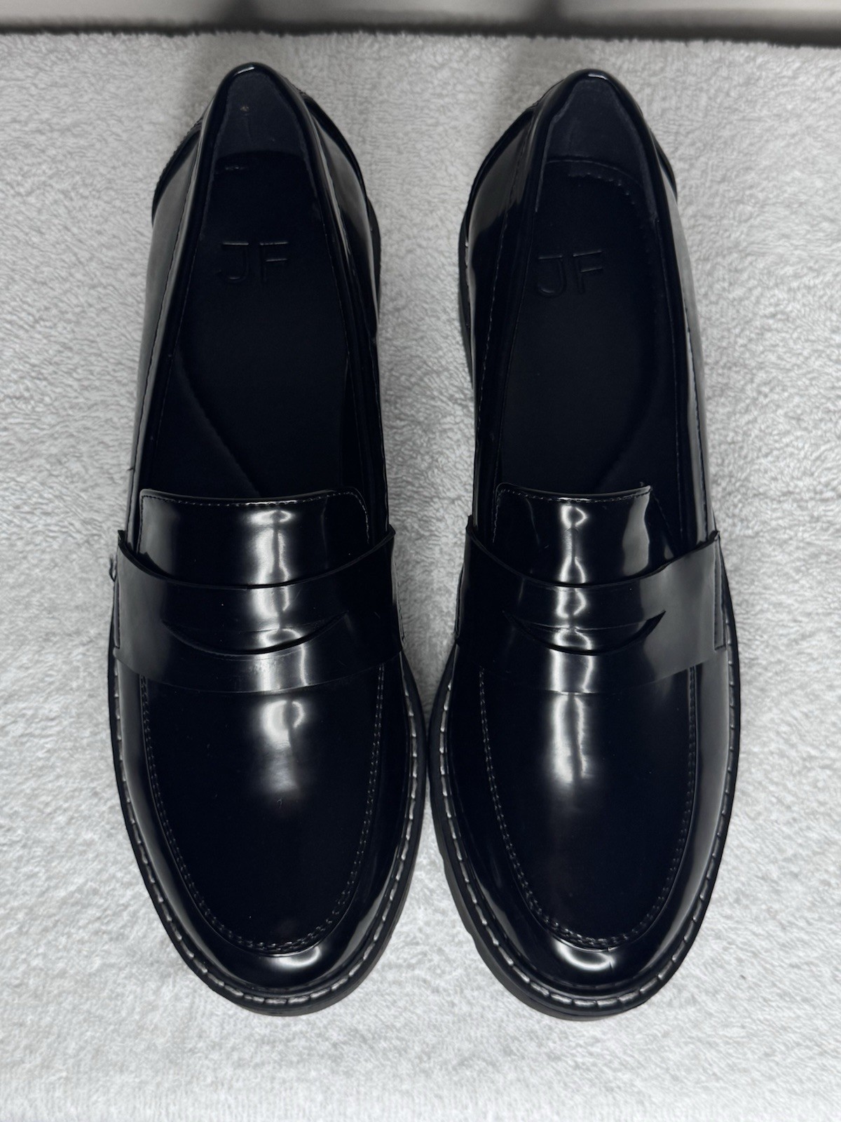 JF black chunky penny loafers in a sleek polished finish. Modern, lightweight, and perfect for work, school, or everyday wear. Brand new — never worn. Condition: Brand New Without Box • Soles show zero wear (see photos) • Uppers flawless and high-shine • Clean interior • No scuffs, marks, or defects Details: • Brand: JF • Style: Chunky Penny Loafers • Color: Black • Size: Women’s 7.5 • Slip-on design • Thick rubber sole for comfort & durability Ships fast and packed with care.