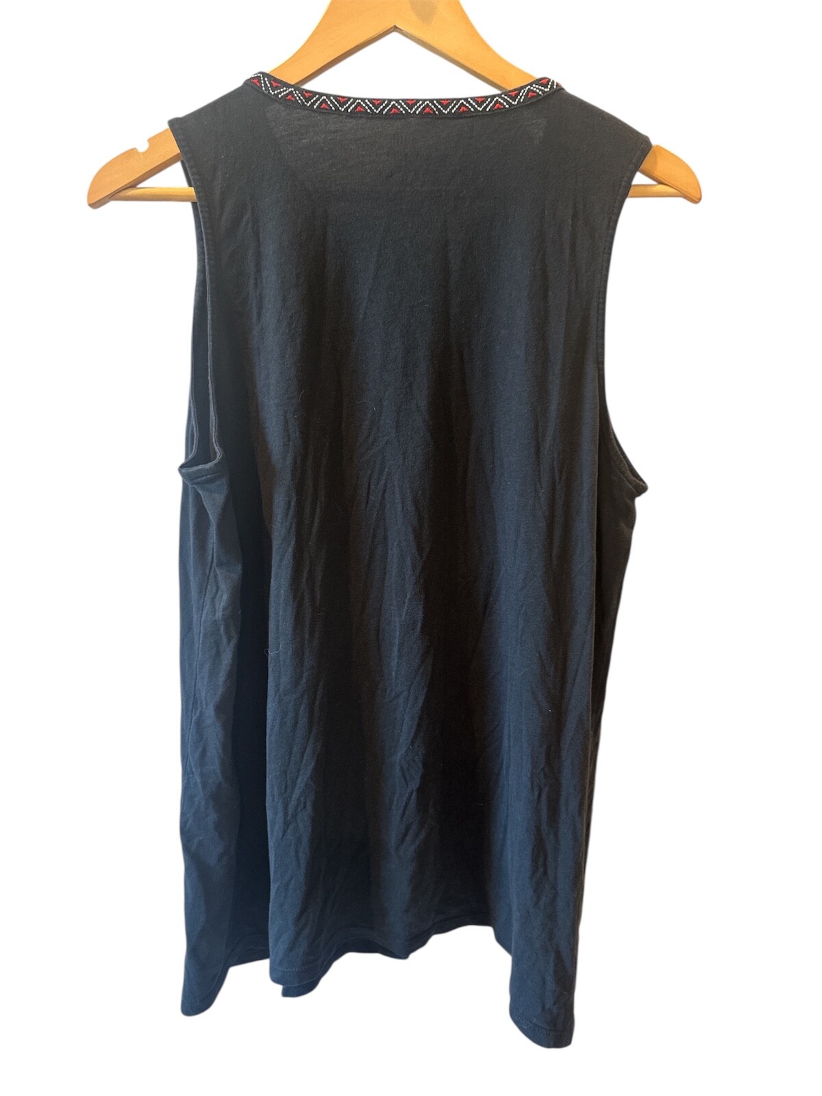 This is a colorful J. Jill tank top in a size medium. It features an embroidered design in black, red, and blue on a knit fabric. The tank has a dip hem style, adding a unique touch to the overall look. Perfect for women looking for a stylish and comfortable top to add to their wardrobe. Item is in excellent condition with no stains, rips, or tears.