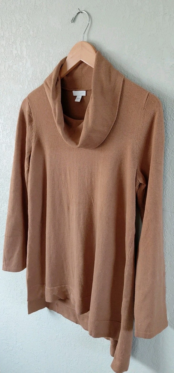 The J.Jill Women's Size Small Brown Draped Cowl Neck Tunic Sweater is a cozy and stylish addition to any autumn wardrobe. Made with a blend of nylon, rayon, viscose, and cotton, this lightweight sweater features a relaxed fit and a hi-low hem style. The cowl neck adds a touch of sophistication, while the raglan sleeves make it comfortable for everyday wear. In a classic solid brown color, this pullover sweater is perfect for layering in the fall season.