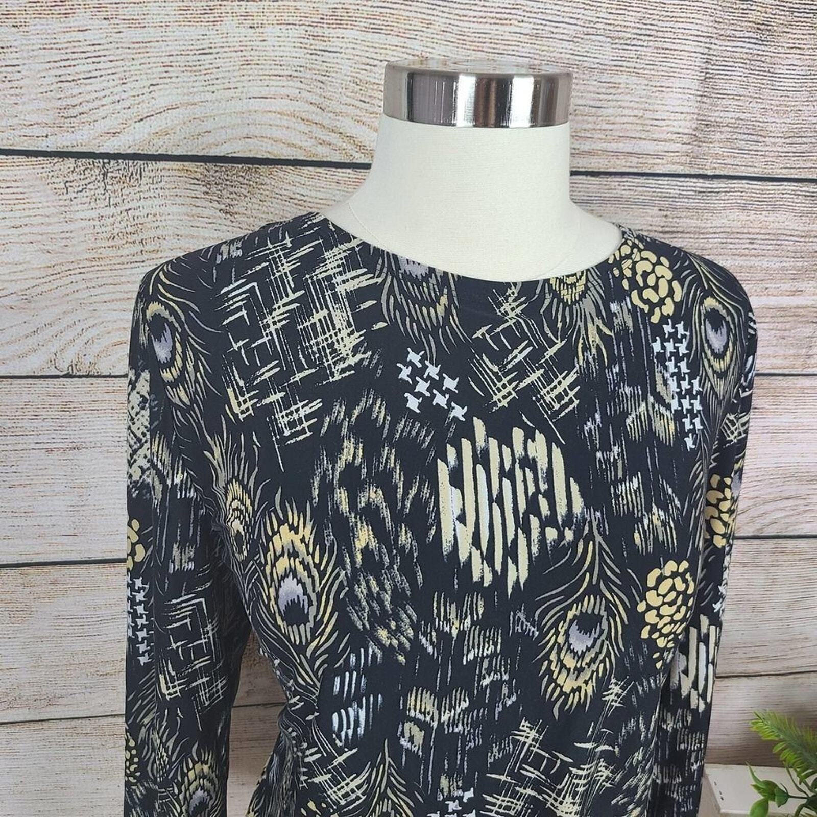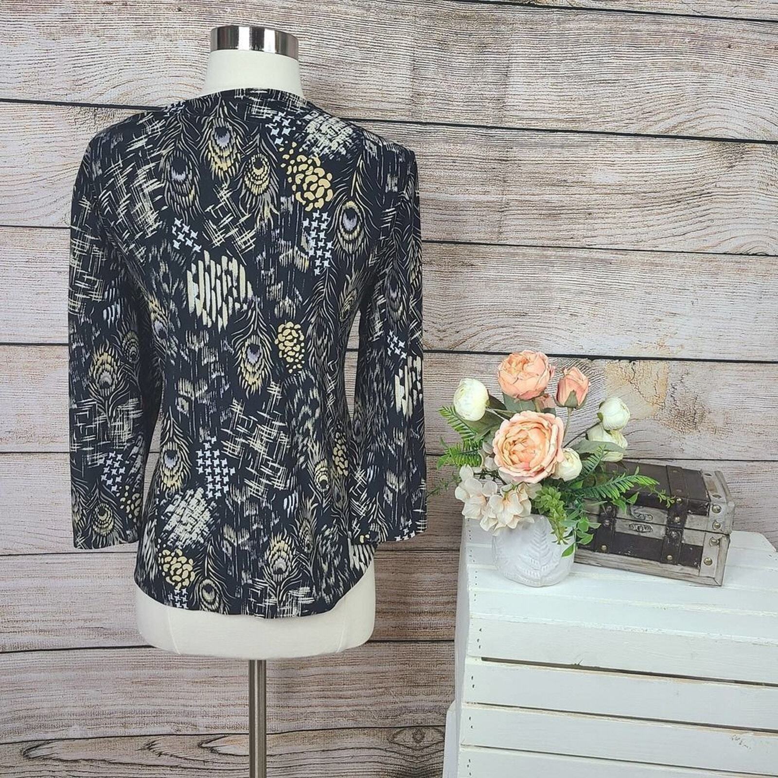 JM Collection Peacock Print Abstract Tee. Cute and soft round neckline. Three Quarter Length Sleeves. Size Large. Excellent Used Condition. 92% Polyester, 8% Spandex. Approximate Measurements Armpit 21" flat Bust 20" flat Length 26"