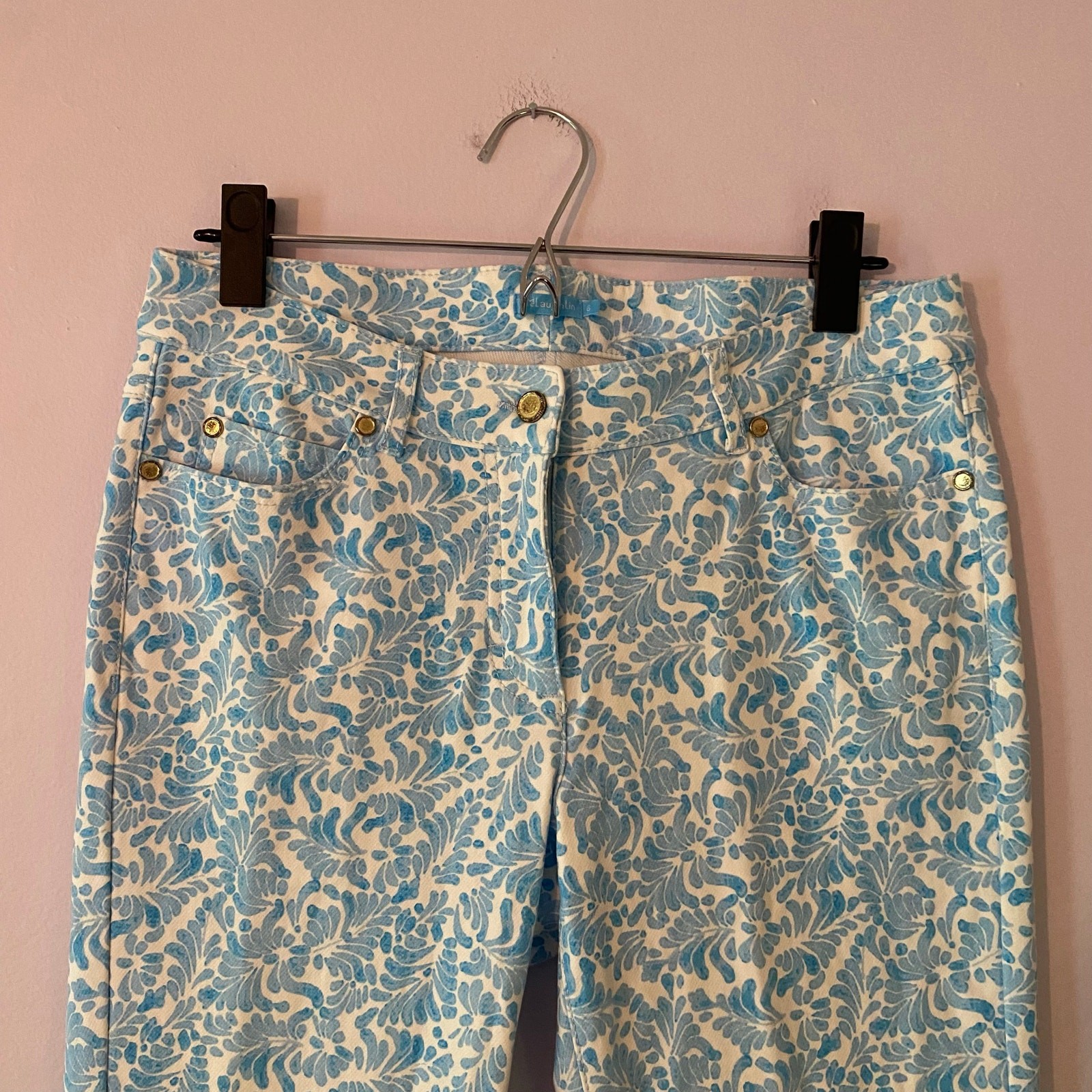 J.McLaughlin Women's size 6 Blue White Floral Patterned Pants Preppy. J.Mclaughlin brand women's preppy pants in a size 6. White background with blue design. Pockets at the hips and back. Skinny fit through the legs. Measurements as pictured. In great pre-owned condition, see photos for more details. Always feel free to ask any questions you may have! Reasonable offers accepted.
