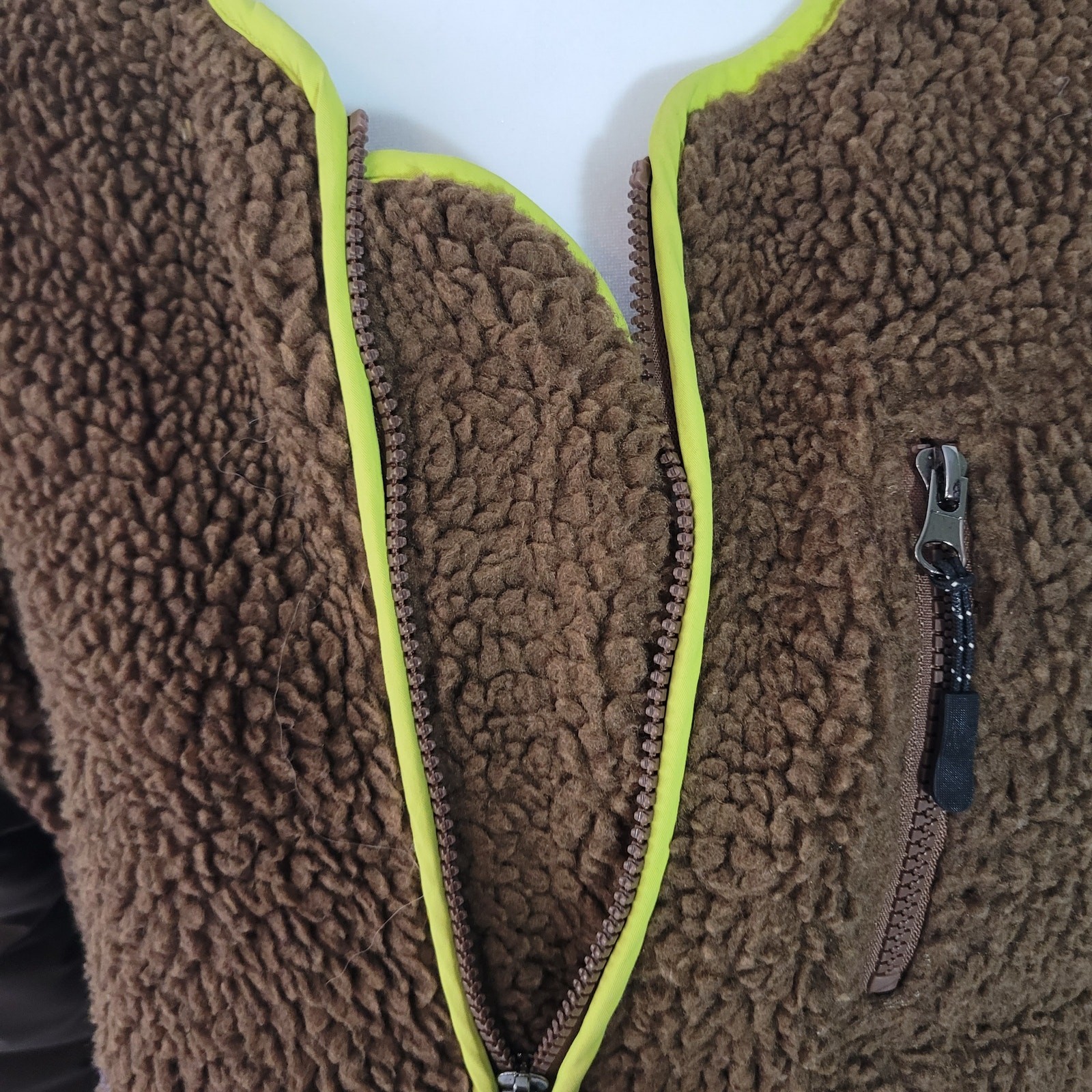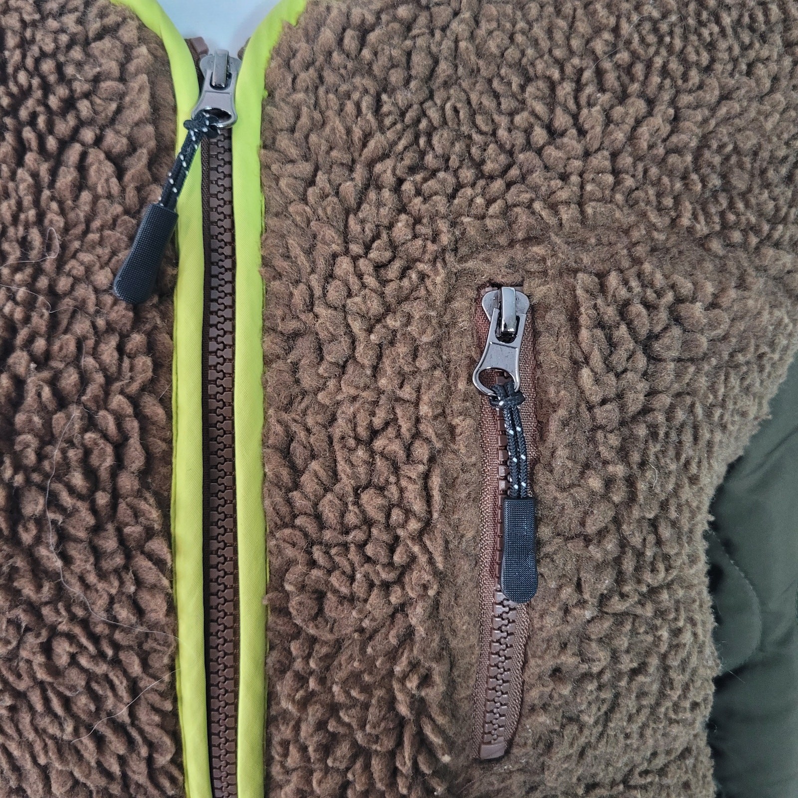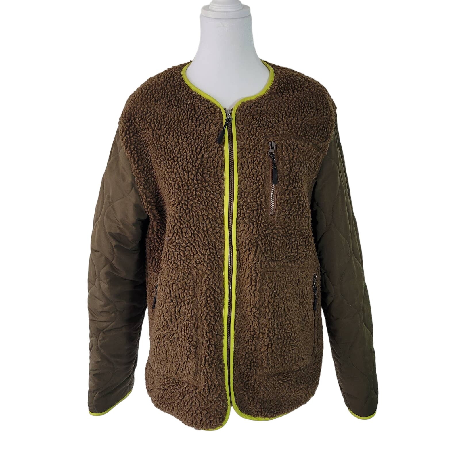This jacket is a total game-changer for cold days! The cozy faux shearling keeps me warm, while the bold lime green trim adds a fun pop of color. I love the quilted sleeves and multiple zippered pockets—both stylish and practical. The fit is perfect, and it’s in amazing condition. A must-have for anyone wanting to stand out while staying comfy!