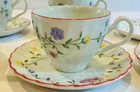 Add a touch of classic charm to your summer table setting with this Johnson Brothers Summer Chintz 3.3/4" Mug. This stoneware mug is part of a set of 7 cups and 8 saucers, making it perfect for serving multi-colored beverages during the summer season. The art pottery production style and printed backstamp make this mug a unique addition to your collection. Crafted in the United Kingdom, this Johnson Brothers mug features a Summer Chintz pattern and is perfect for any occasion. The mug is not vintage, but it is a part of the Summer Chintz product line, which was manufactured between 1990-1999. This set is perfect for anyone who loves pottery and is looking for a unique addition to their collection. Johnson Brothers Summer Chintz Cups & Saucers 7 cups 8 saucers Made in England 3.3/4" Cup 5.5" Saucer Like New Condition