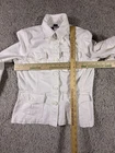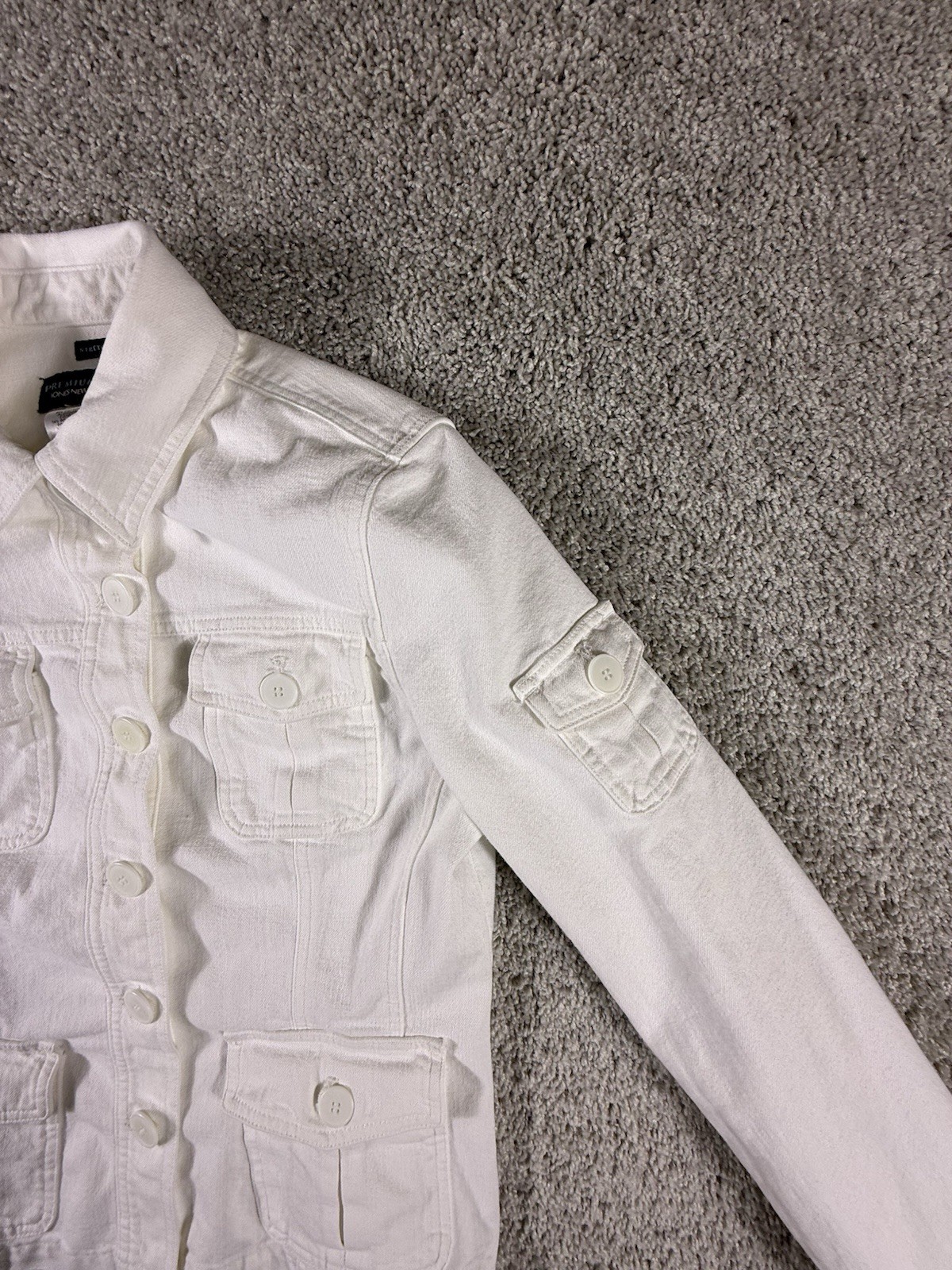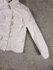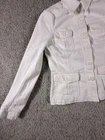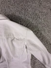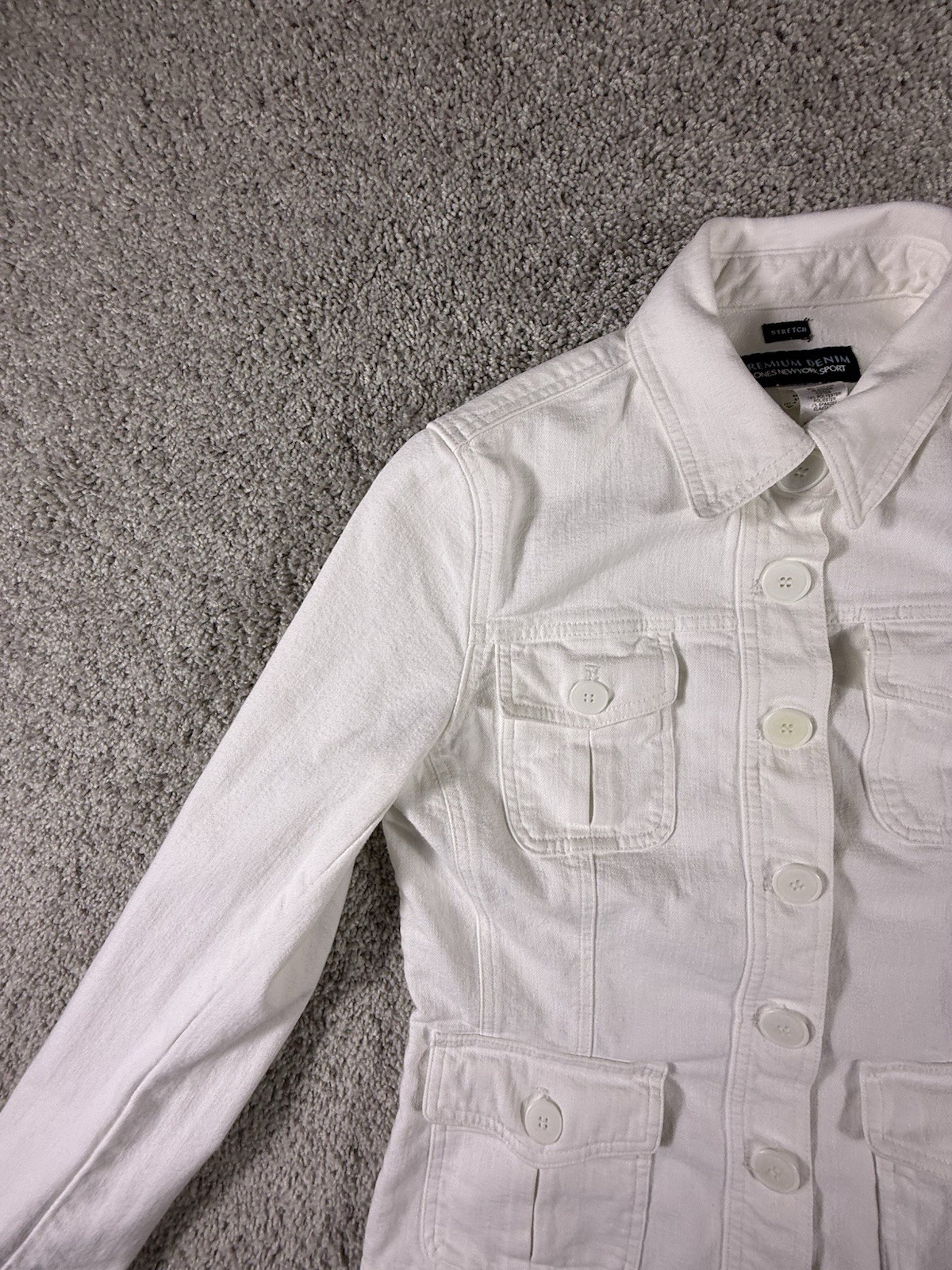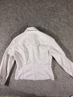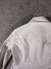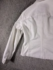 The Jones New York Sport Women's White Stretch Jean Jacket in size Small is a stylish and versatile outerwear piece perfect for travel, casual outings, workwear, and business occasions. Made from a comfortable cotton blend with a denim lining, this short jacket features a solid white color, long sleeves, and a button closure. The classic fit and stretch fabric make it a practical and fashionable choice for everyday wear. The jacket also includes logo accents, adding a touch of sporty style to the basic jacket design. 4304