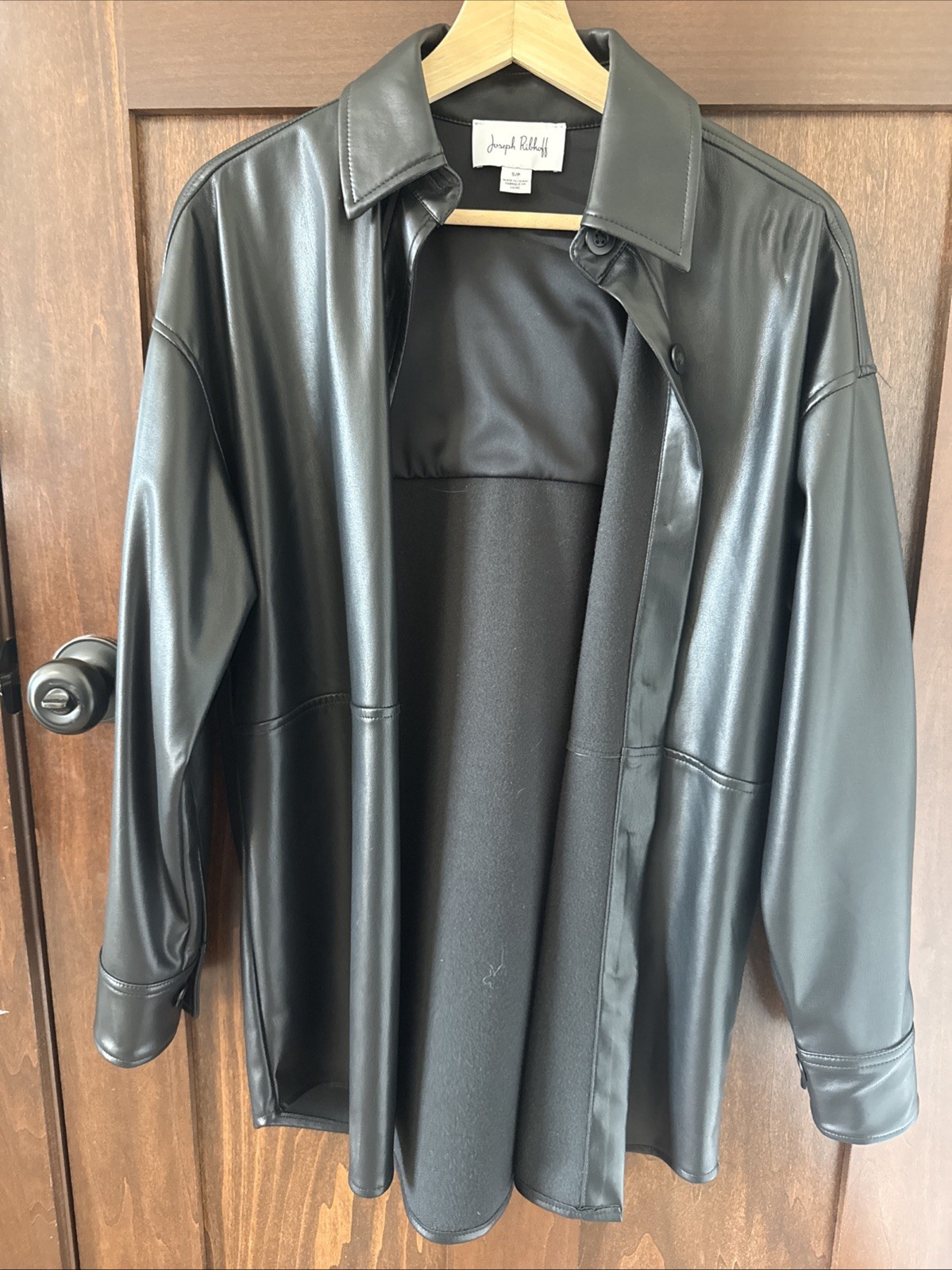 The JOSEPH RIBKOFF Black Faux Leather Shaket in size small is a stylish and versatile jacket perfect for a casual occasion. Made from durable polyurethane material, this jacket is machine washable for easy care. The black color and basic jacket style make it a timeless wardrobe staple suitable for fall. With polyester insulation, this shaket is both fashionable and practical, ideal for everyday wear. Tags have been removed, but it has never been worn. Excellent condition.