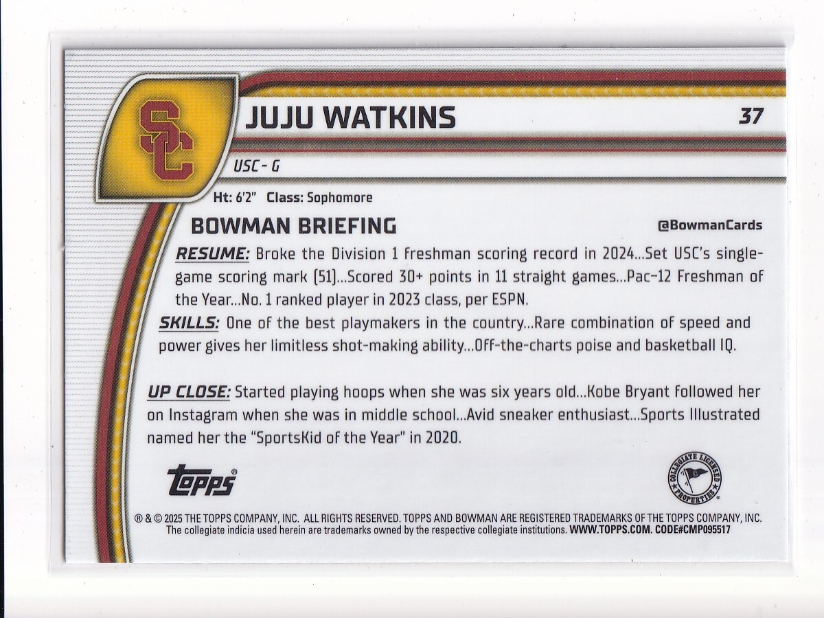 JUJU WATKINS - 2025 Bowman University Chrome - Base #37 - USC Trojans