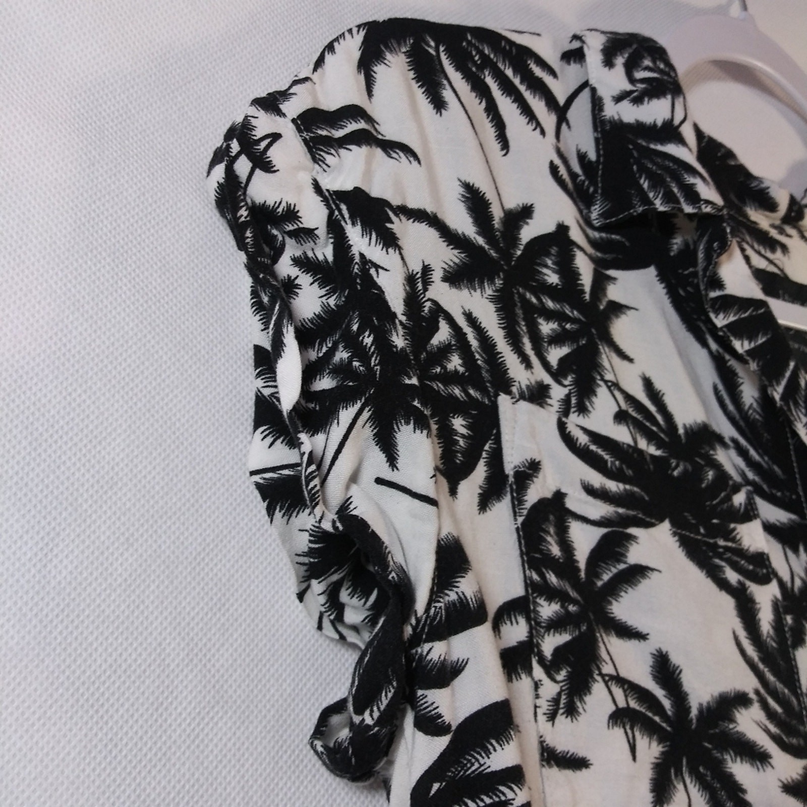 Jachs Girlfriend White Black Palm Tree Print Top High Low Button Front Size M Cuffed short sleeve Button front Collard High low hem Light weight Gently worn approximate measurements pit to pit 18" length front 21" length back 30"
