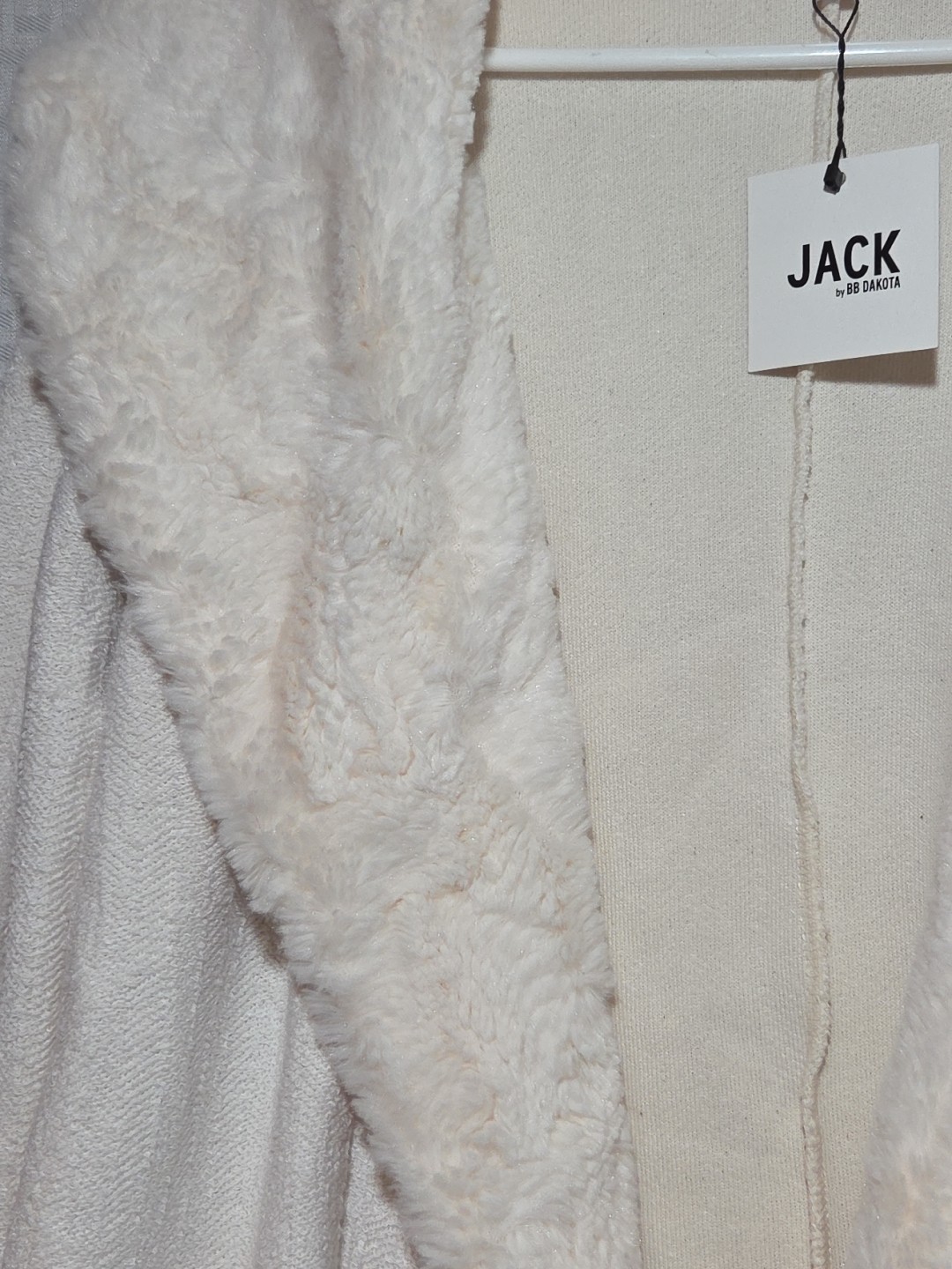 The Jack by BB Dakota small ivory Cardigan is a stylish and versatile addition to any wardrobe, featuring a faux fur collar and pockets for added texture and detail. This short, long sleeve coatigan is perfect for various occasions, from casual to formal, with a solid pattern and knit fabric that adds a touch of sophistication. The open front closure and hand wash care instructions make it easy to maintain, while the accents of fur trim give it a unique and chic look that is perfect for the winter, fall, and spring seasons. New with tags From a smoke and pet free home Faux fir collar Soft Elegant Pockets Ivory Classic Preppy This is heavier weight. The faux fur goes all the way down the collar line. Took pictures of the collar open and closed