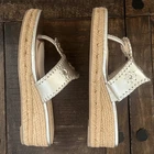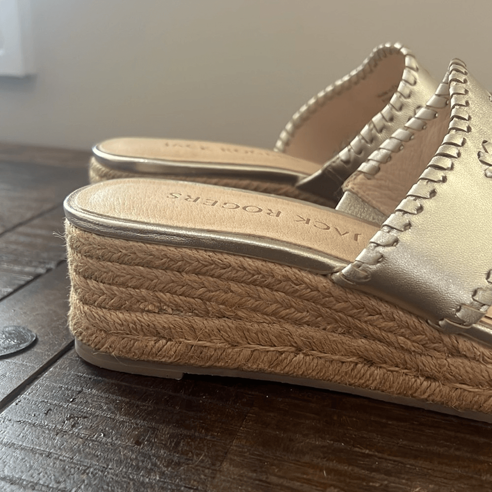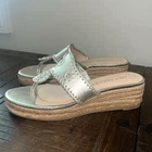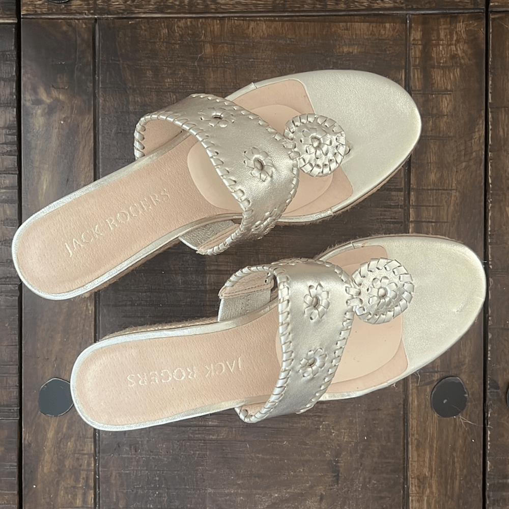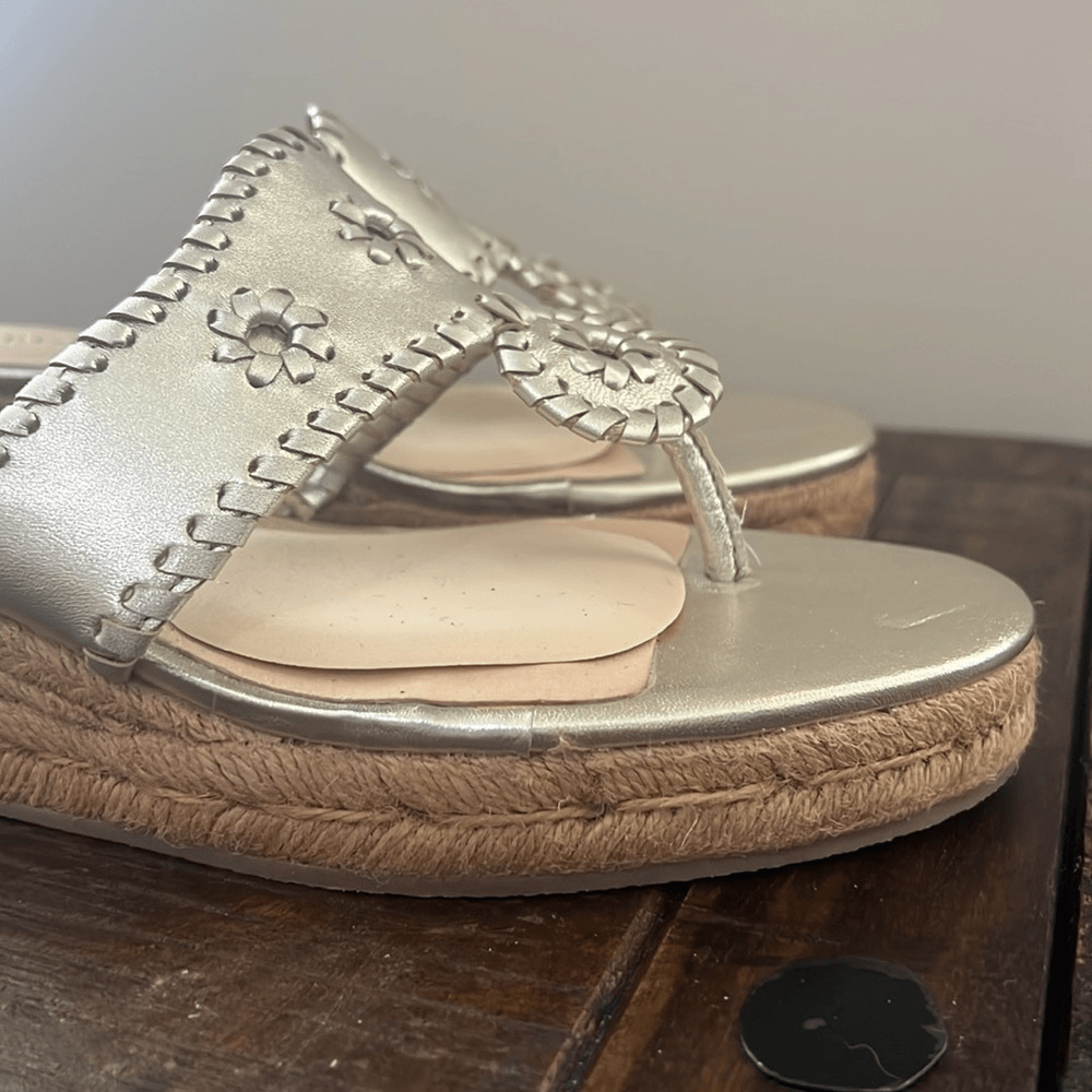 Jack Rogers Espadrille Wedge Sandals Size: Women's 8.5 Excellent condition. Very clean and almost no signs of any wear. There are some cushion inserts as seen in photos. Color: Varish Silver - To me they have have a hint of gold