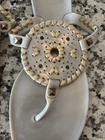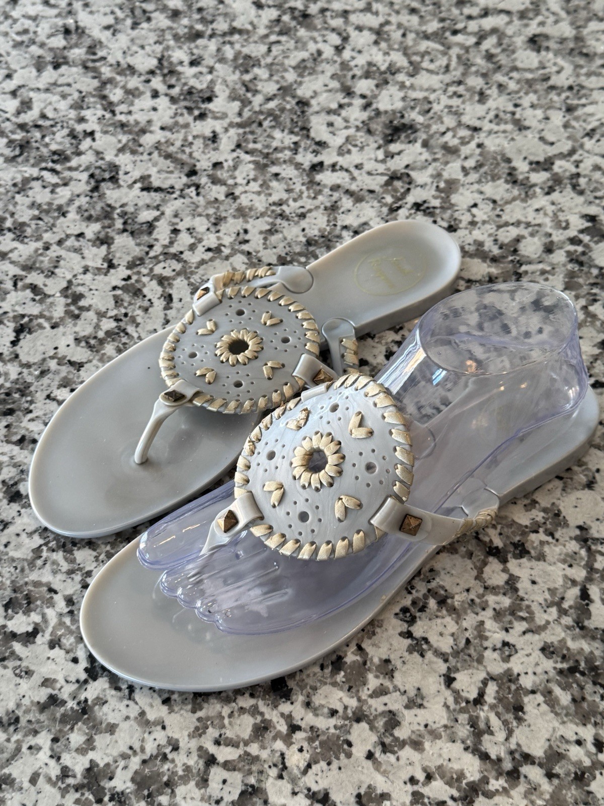 The Jack Rogers Georgica Jelly Sandals in Gray with Silver and Gold accents are a stylish and comfortable choice for women. The slip-on design and flat heel make them easy to wear all day, while the lightweight synthetic upper material adds a touch of luxury. Perfect for adding a metallic touch to your outfit, these thong-style sandals are a versatile option for any summer ensemble. See all pictures!
