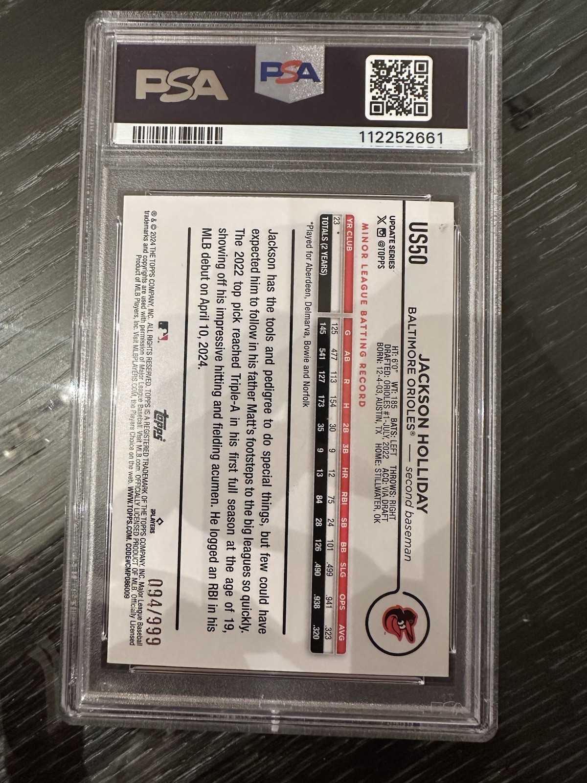 The product is a 2024 Topps Update Blue Holo Foilboard trading card featuring rookie player Jackson Holliday from the Baltimore Orioles. This single card is serial numbered out of 999 and has been graded as a PSA 10. It is an original release by Topps for baseball fans and collectors, showcasing a parallel variety with a unique design for the 2024 season.