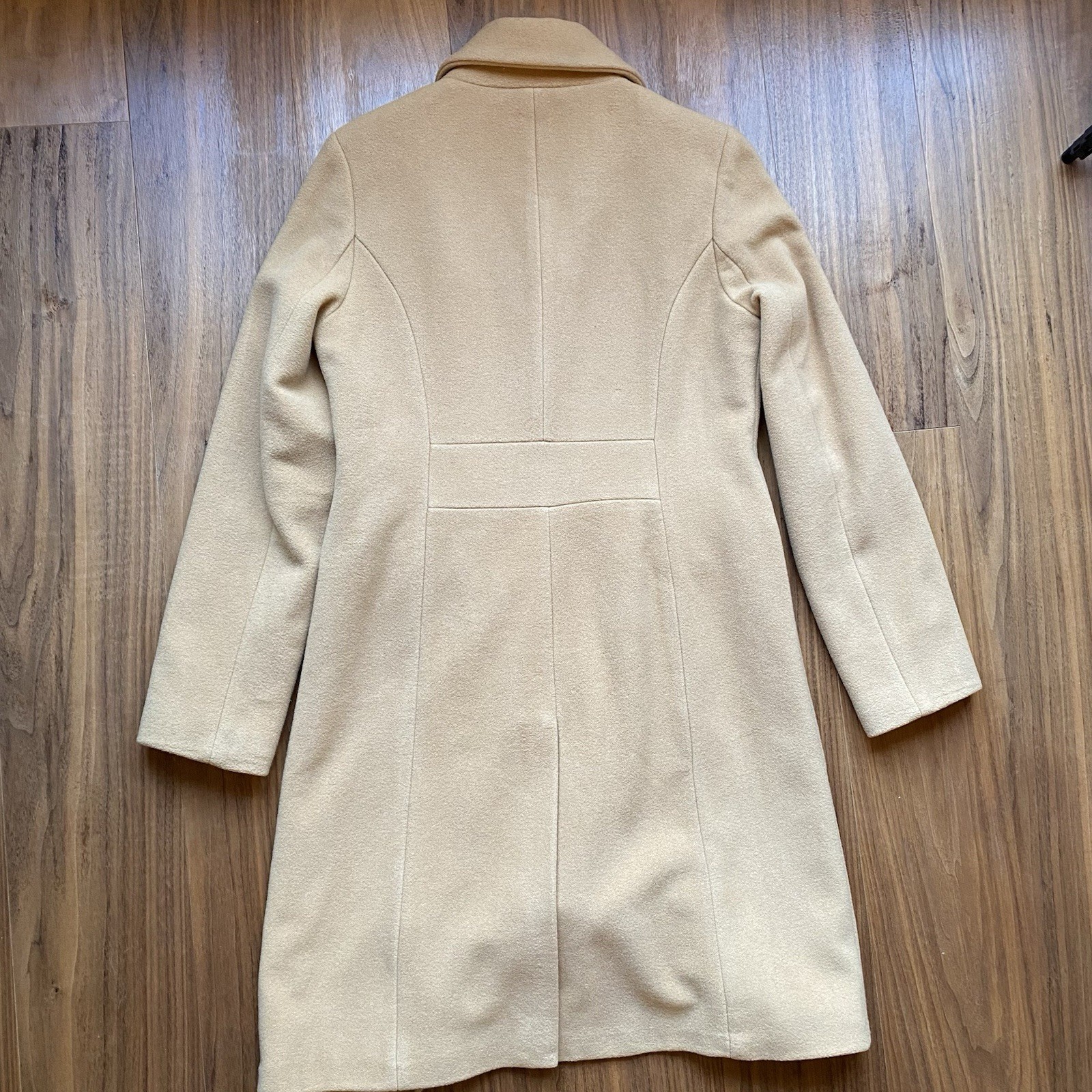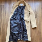 Beautiful classic camel long coat featuring a warm wool-blend shell and a luxury-inspired horsebit patterned lining. Tailored silhouette with button front closure and flap pockets. Versatile for work, dressy outfits, or everyday winter wear. Condition: Great pre-owned condition. No holes or stains noted. Color: Camel Shell Material: 60% wool, 25% polyester, 15% rayon Lining: 100% polyester