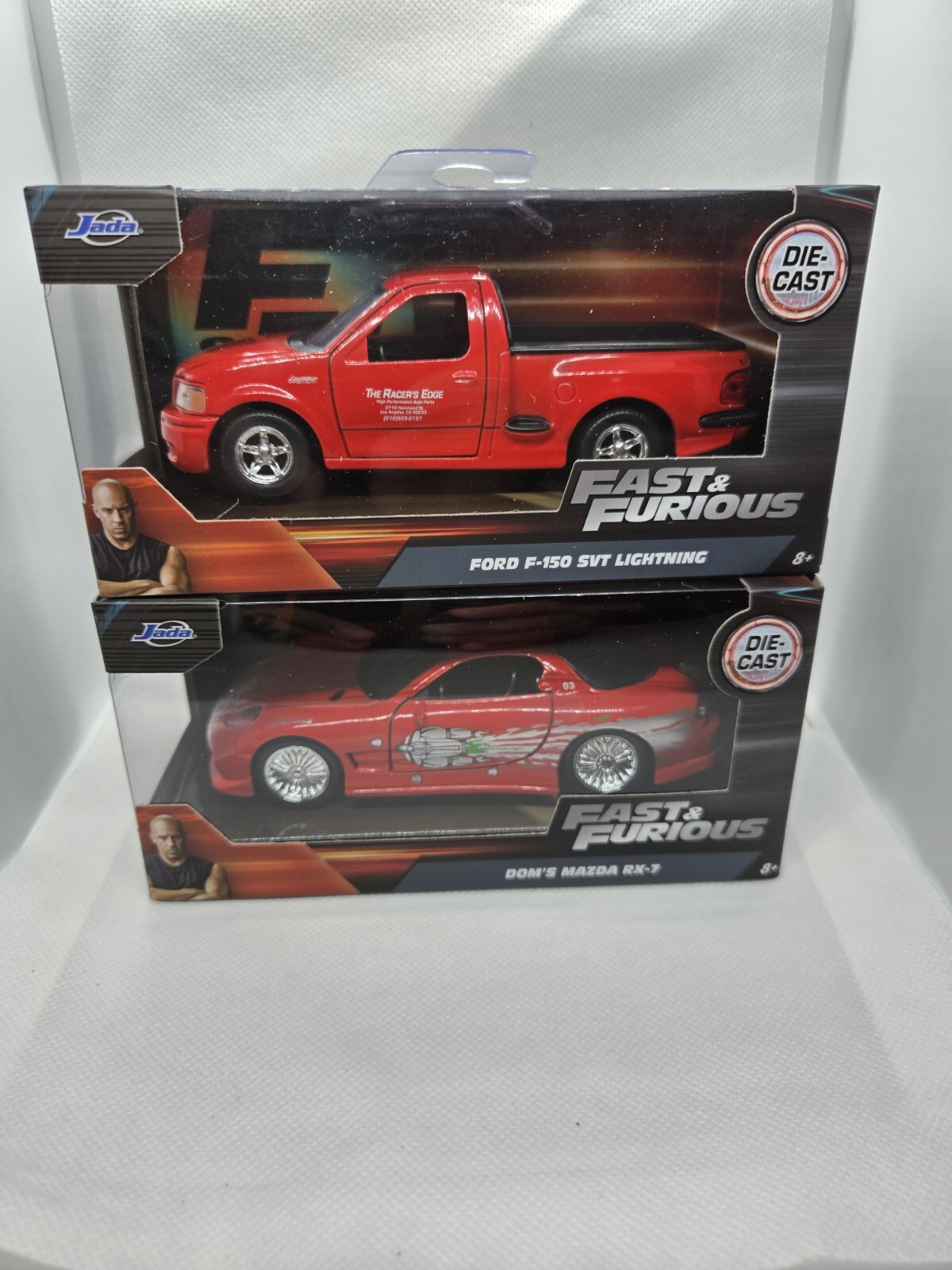 This Jada Fast and Furious toy set features Dom's Mazda RX-7 and Ford SVT Lightning in stunning detail. The diecast and toy vehicles are perfect for collectors and fans of the Fast & Furious series. The set includes two cars, both in excellent condition, and is a great addition to any collection. The brand, Jada Toys, is well-known for producing high-quality diecast cars and this set is no exception. The series, Fast & Furious, is one of the most popular film franchises and this set is sure to please fans. The vehicle make, Ford, is also a popular choice among car enthusiasts. Don't miss out on the opportunity to own this fantastic set!