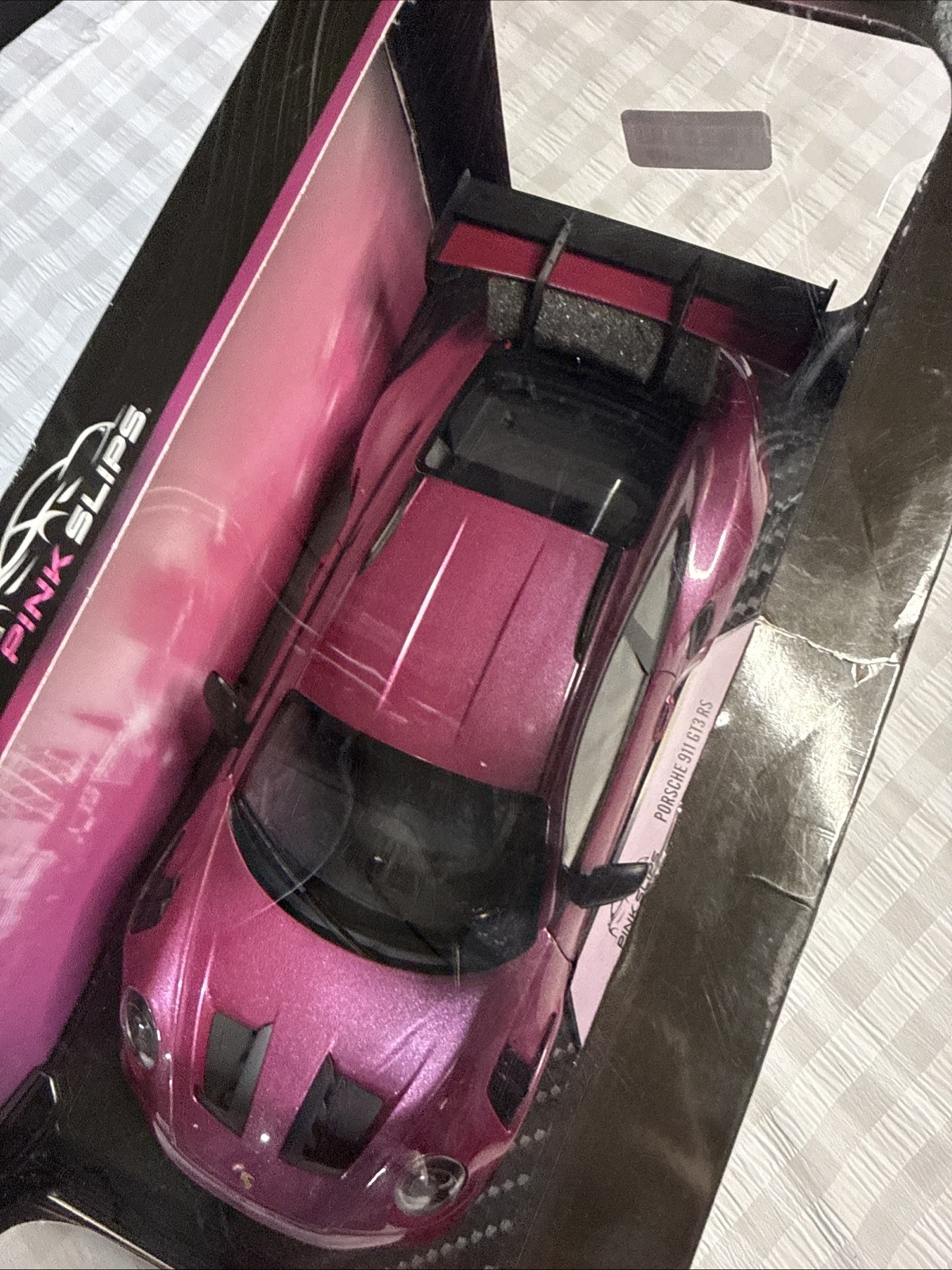 The Jada Pink Slips Porsche 911 GT3 RS 1:18 in a new purple color is a highly detailed die-cast collectible for car enthusiasts aged 17 years and up. The model features the iconic Porsche design with a unique pink slip motif, making it a rare and sought-after addition to any toy or die-cast vehicle collection. The unopened box adds to the appeal of this limited edition collectible from Jada Toys, perfect for both boys and girls who love cars and contemporary manufacture toys.