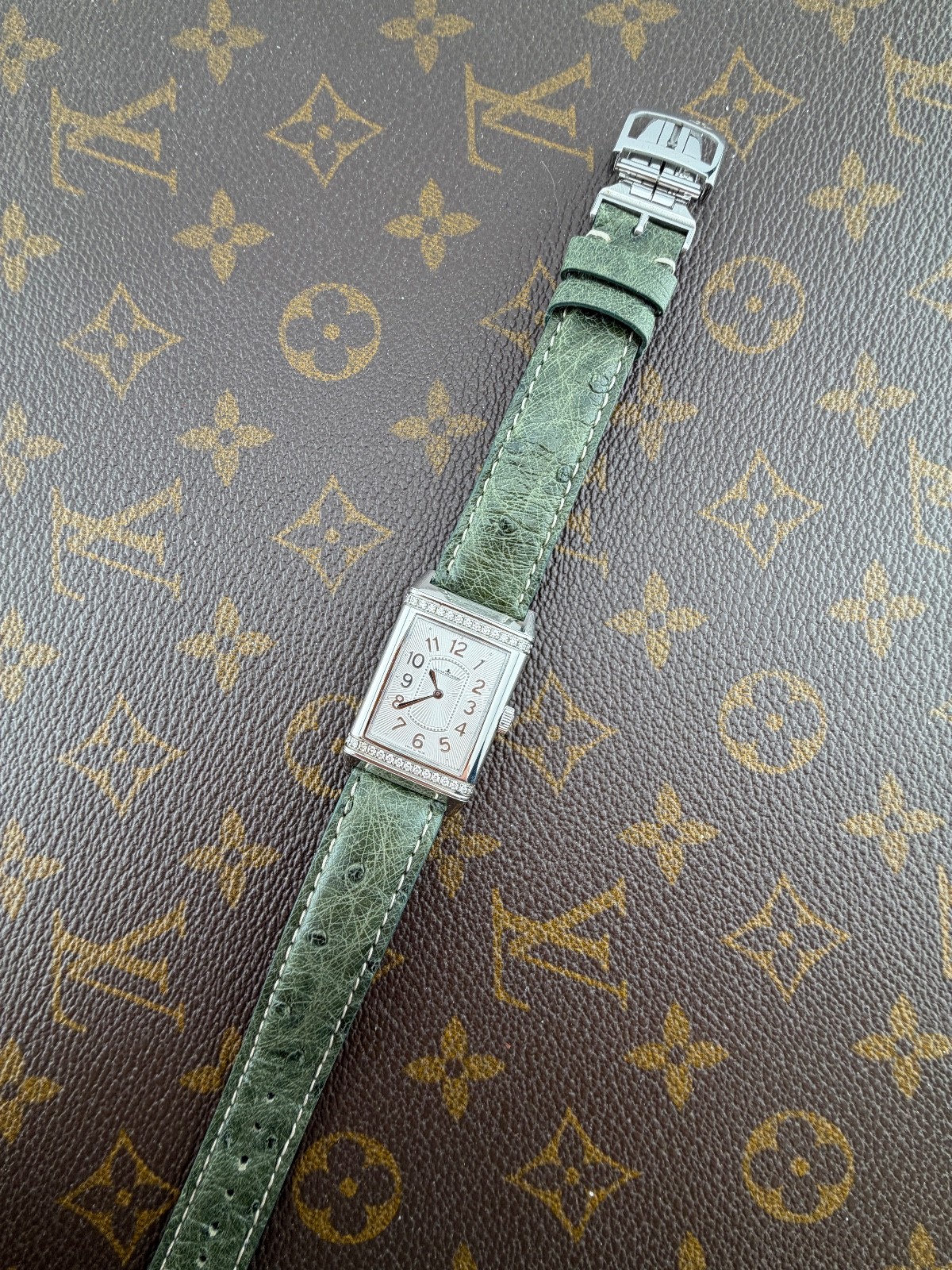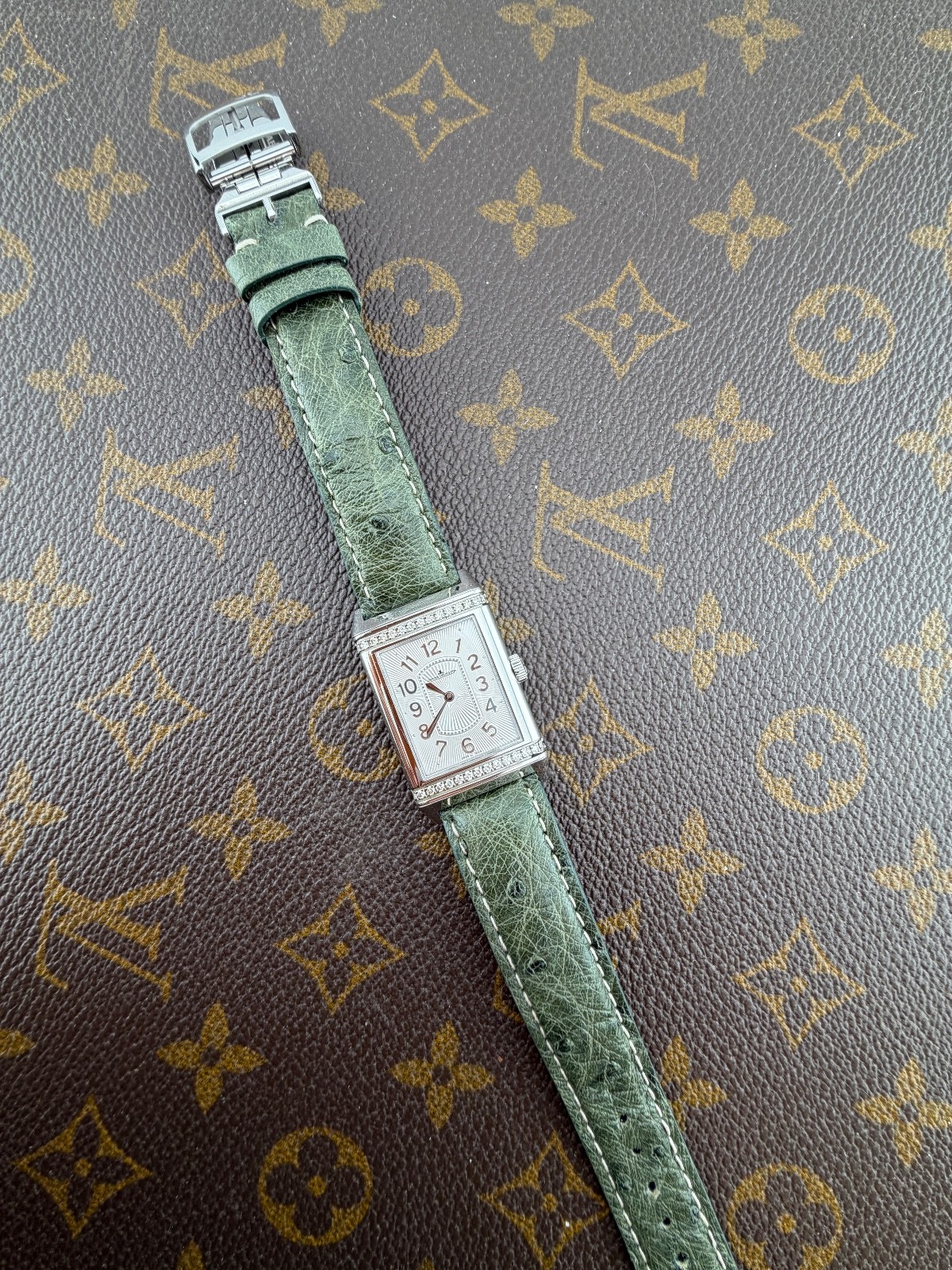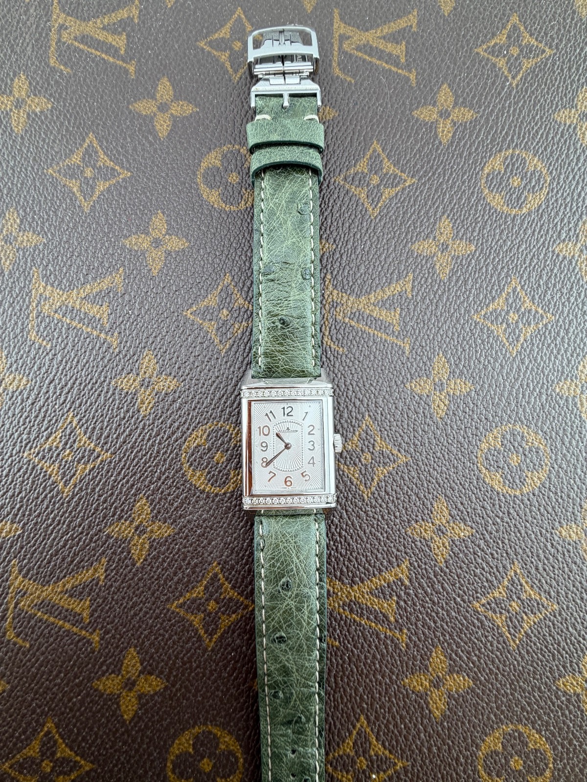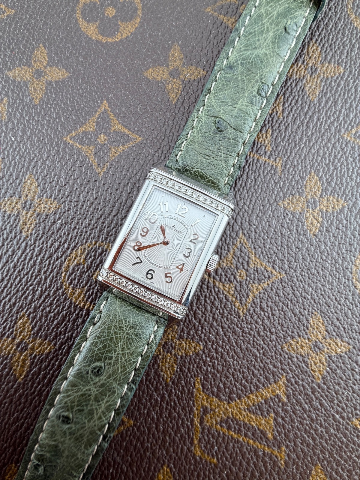 PROPONIAMO; -Marca: JAEGER LE-COULTRE REVERSO DIAMOND ULTRA-THIN -Cassa: ACCIAIO DA 24X40 MM , FONDELLO ORIGINALE GARANTITO 3 BAR -Movimento :CALIBRO JLC 846.1 CARICA MANUALE (CONTROL 1000 HOUR) -Vetro:ZAFFIRO -Corona:ORIGINALE -Ghiera: ORIGINALE CON VERI DIAMANTI -Tasti: NO -Quadrante: ORIGINALE BIANCO CON INDICI NUMERI ARABI APPLICATI -Lancette: ORIGINALI -Cinturino/Bracciale: PELLE ORIGINALE DA 18 MM JAEGER , FIBBIA DOPPIA CHIUSURA DEPLOYANTE ORIGINALE IN ACCIAIO -Scatola e documenti: NOSTRA POCHETTE IN VELLUTO COMPRESA + POCHETTE ORIGINALE JAEGER -Condizioni :OTTIME -Revisionato:SI -Uomo/donna/unisex:UOMO/UNISEX PER QUALSIASI DUBBIO CONTATTATEMI ,RISPONDEREMO IL PRIMA POSSIBILE
