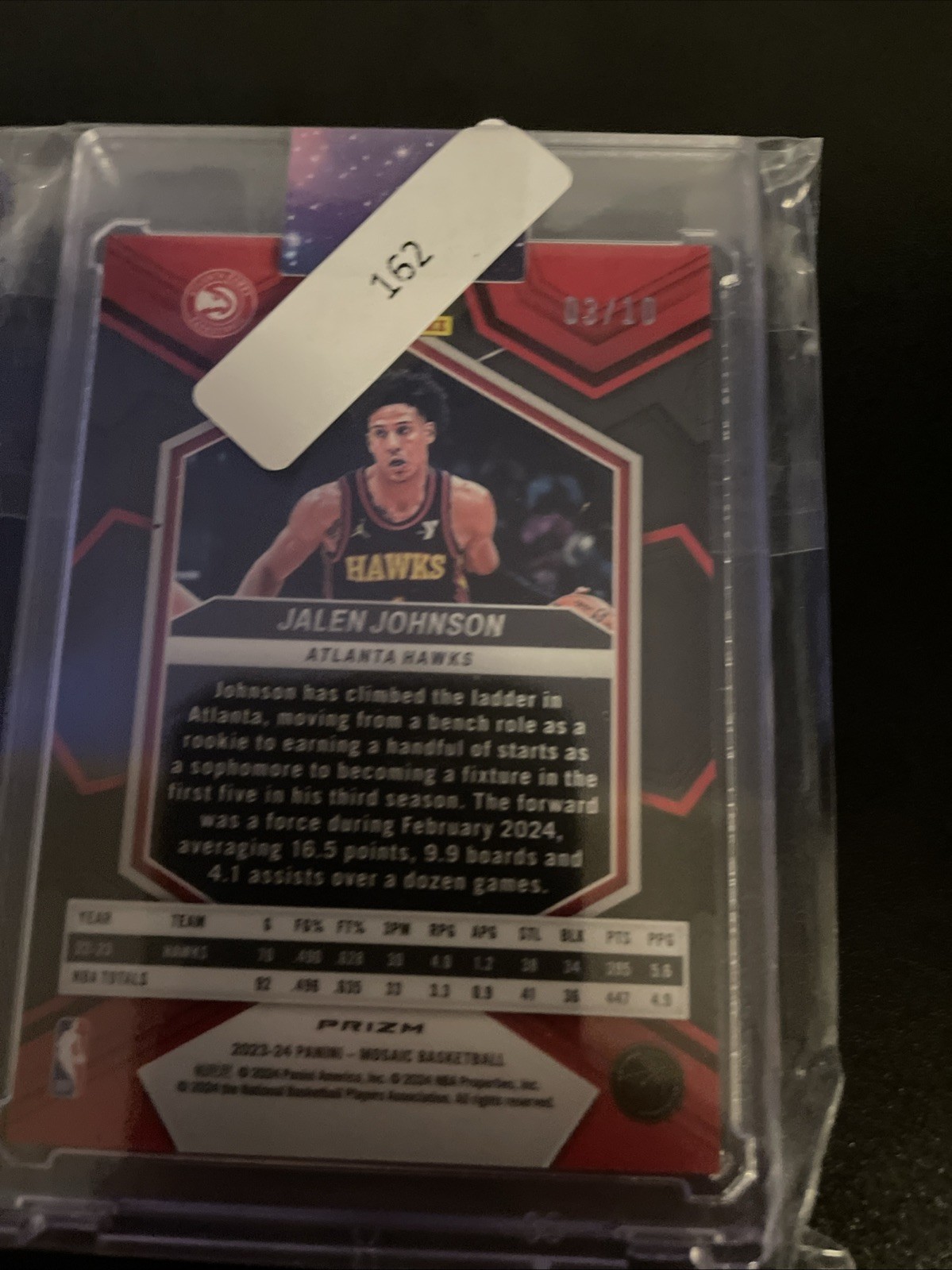 The Jalen Johnson Mosaic True Gold trading card is a rare and highly sought-after collectible item for basketball fans and card collectors. Limited to only 10 copies, this card features a unique mosaic design showcasing the talented player in a stunning gold finish. As a valuable addition to any sports trading card collection, this item is sure to be a prized possession for fans of Jalen Johnson and basketball memorabilia.
