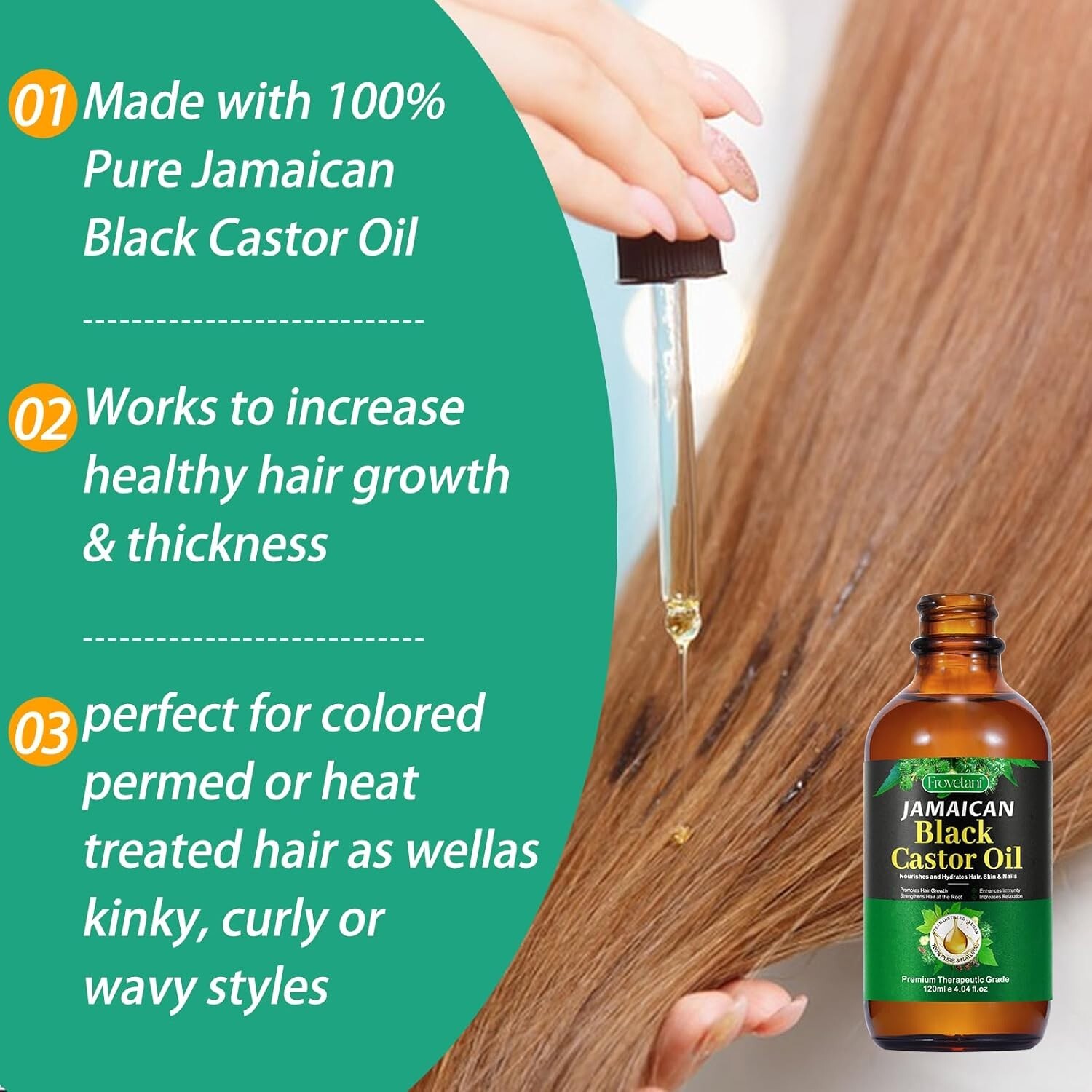 Jamaican Black Castor Oil, Organic Castor Oil for Hair Growth, Cold Press Unrefined, Thicker Eyelashes and Eyebrows, Massage Oil for Aromatherapy 60ML/2 fl oz (PACK OF 1) ORGANIC CASTOR OIL - Our Organic Cold Pressed Castor Oil Made Of Pure, Natural, and Organic Ingredients, riches in omegas and fatty acids that condition roots and nourish hair follicles for healthier, stronger and fuller looking hair, lashes and brows, it's the key vitamins and nutrients to hair growth. STIMULATE HAIR GROWTH: Our jamaican black castor oil hydrating for hair & skin. It's an all-natural way to thicken & strengthen hair to reduce hair loss & hair growth, Organic castor oil is a natural essential oil for dry brittle hair, dry scalps, and dandruff. HYDRATE & SOOTHE DRY SCALP: Our Organic castor oil rich blend of over multiple essential oils, Massage Organic Castor Oil onto dry areas of the skin and scalp to restore moisture and softness, combat dandruff while working to strengthen, lengthen, nourish, and protect hair. FOR BEST RESULTS: Warm a quarter sized amount of our Organic Castor Oil into the palms of your hands and spread evenly all over scalp. Comb through from roots to ends. Leave in overnight or at least 1 hour, then wash out with shampoo to reveal deeply-hydrated, luscious-looking hair. WIDELY APPLICATION: This all natural formula jamaican black castor oil is good for eyebrow, nails, hair, skin and massage, hydrates more than just your hair and scalp, Also for skin makes a nourishing, skin-softening moisturizer for face and body, suitable for all skin type, perfect for massage therapy as well as. Note: This Product is designed to deliver optimal results, offering high-quality performance and satisfaction. Please note that individual experiences and outcomes may vary based on personal use, preferences, and unique circumstances. For best results, we recommend following the provided guidelines and ensuring the product is used as intended. Product result may vary for every individual.