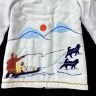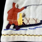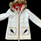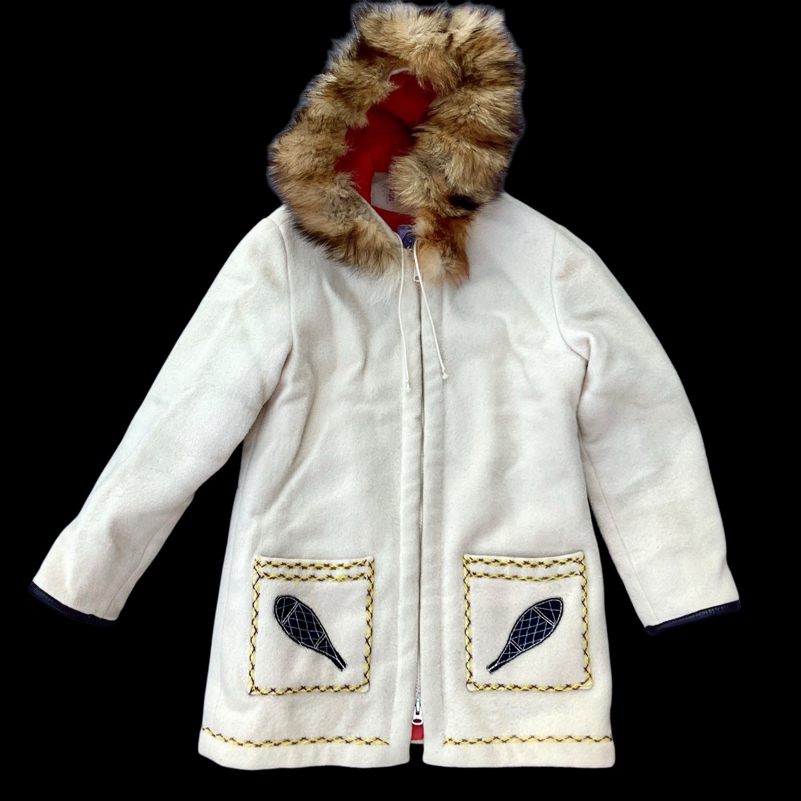 This vintage James Bay parka is made with 100% virgin wool with colourful embroidery and appliqués of snow shoes and dog sled imagery. This blanket coat is thick and fully lined with red quilted 100% nylon. It has a faux-fur trimmed hood, a large two-way zipper and two front pockets. This unique jacket was likely made for use in the northern Arctic. Made in Quebec, Canada. The coat has some light wear (eg. loose threads on quilted lining, light wear on wool fabric in areas of high friction) but is in great vintage condition for its age with no stains or flaws. Tag: No size tag — see measurements below. Chest (pit to pit): 20” Sleeve: 23” Length: 33” US buyers are responsible for any applicable US tariffs or duties. This item ships from Canada and is made in Canada.