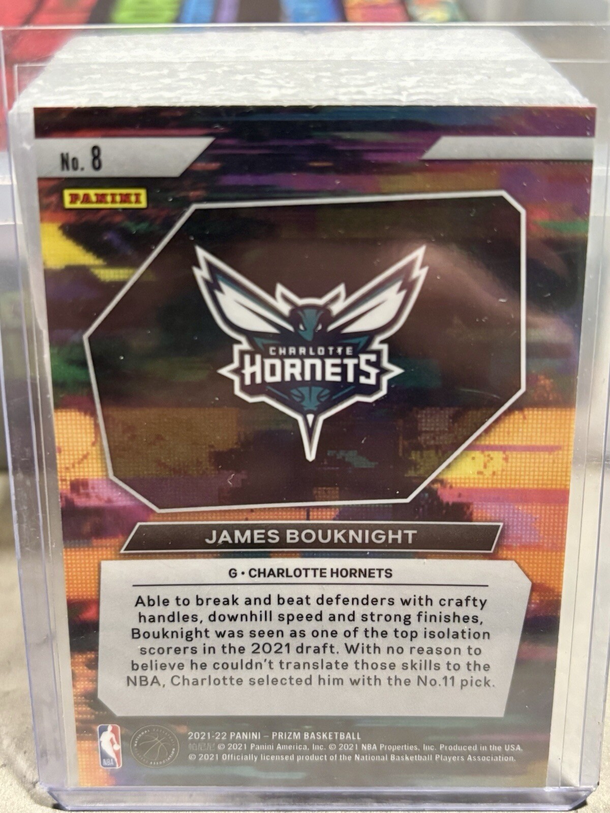 James Bouknight Charlotte Hornets 2021-22 Prizm NBA Instant Impact Rookie #8 trading card is a must-have for any basketball card collector. This original Panini product features a standard card size made of card stock, depicting the talented rookie player in his Charlotte Hornets jersey. A part of the 2021-22 Prizm set, this English-language card showcases Bouknight in a Prizm parallel variety, adding to its appeal. Perfect for fans of the National Basketball Association (NBA) and the Charlotte Hornets, this modern card is a great addition to any sports trading card collection.