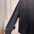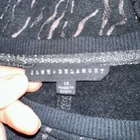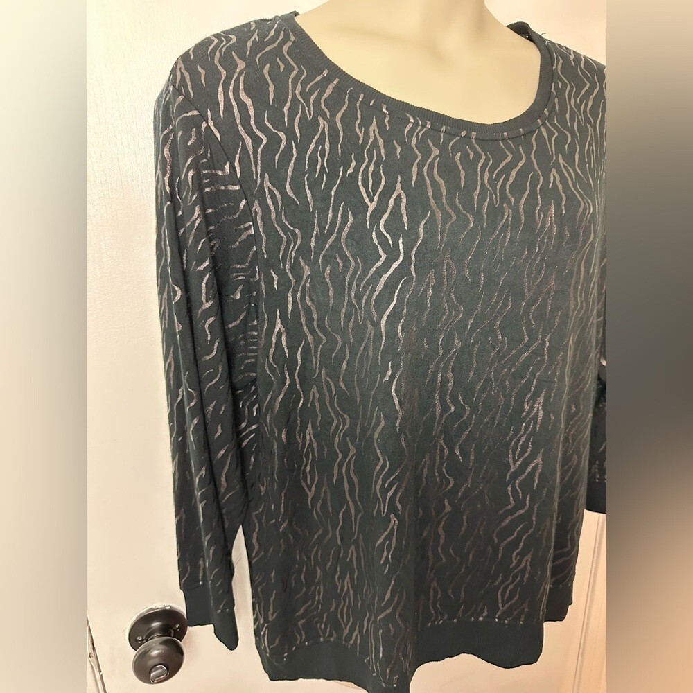 Jane + Delancey Size 1X Sweater Super Soft Jersey Knit Fleece Lined Shimmer Tagged as Size 1X Black with color changing curved stripes (depending on lighting condition) Self: 87% rayon, 13% polyester Trim: 96% rayon, 4% spandex Hand washing recommended Excellent pre-owned condition. No rips, stains or other signs of significant wear Flat Measurements: Bust Measures (around garment at armpits) 51 in Waist Measures (approximately 6" below bust) 53 in Hips Measure (approximately 6" below waist) 54 in Shoulders Measure (across back at tops of sleeves) 19.5 in Sleeves Measure (from shoulder seam to hem) 22 in Length Measures (from top of shoulder to back hem) 29.5 in Features: • Luxuriously soft fleece lined jersey knit fabric • Ribbed knit trim at neckline, sleeve hems and hem • Allover shimmering striped print • Pullover