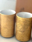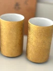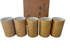 Up for your consideration Vintage Japanese Tea Set-5 Gold Porcelain Clay Tea Cups In Wooden Box Kutani Ware-signed Includes 5 cups marked on bottom in excellent- used conditon. They were purchased from a private estate sale from the widow of the American Ambassador to Japan .She said they were part of his personal items taken out of Japan prior to WWII -when he left on final trip out of Japan in 1941. Cups measure 4" tall and hold 6 oz I am not an expert and open to feedback or questions