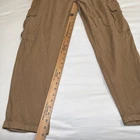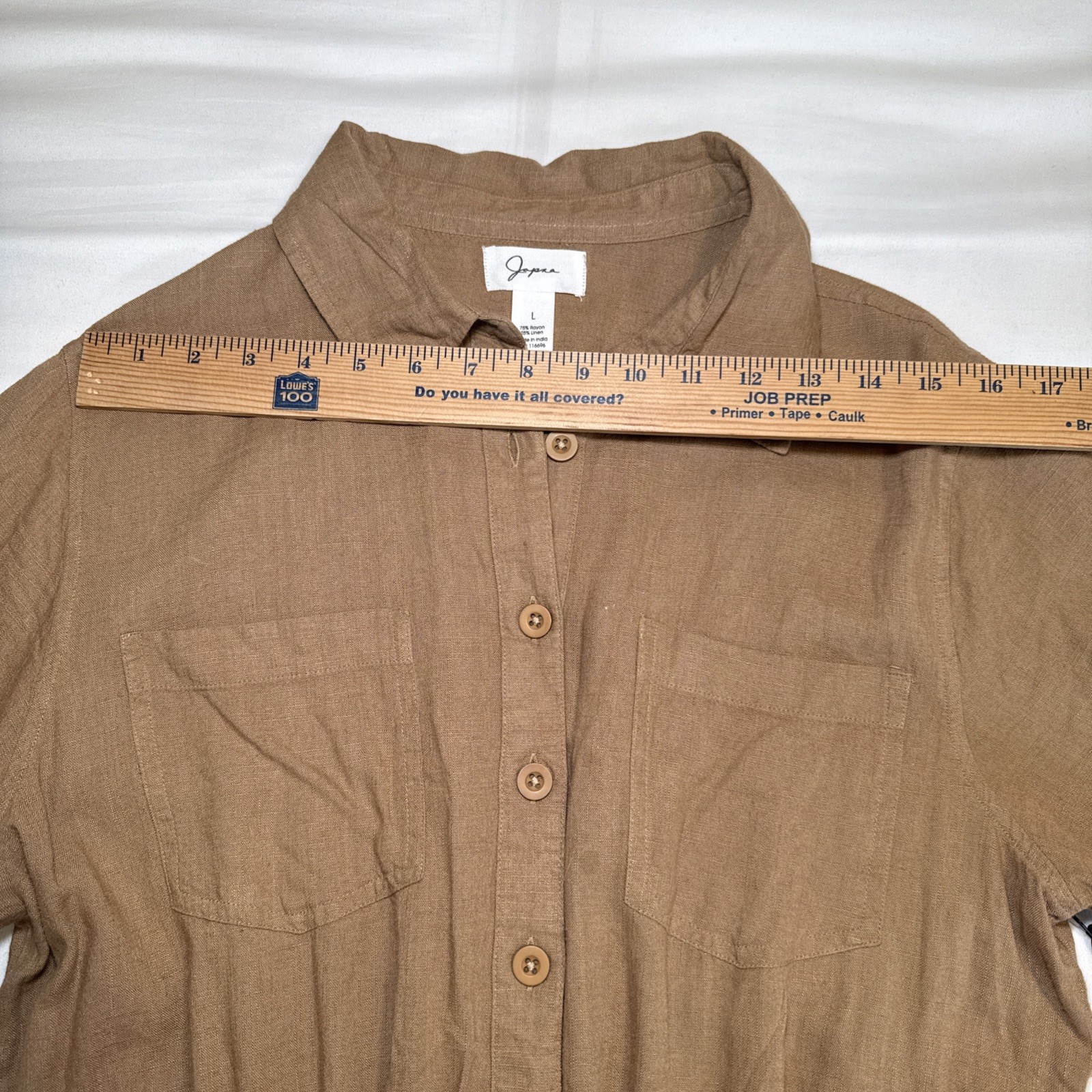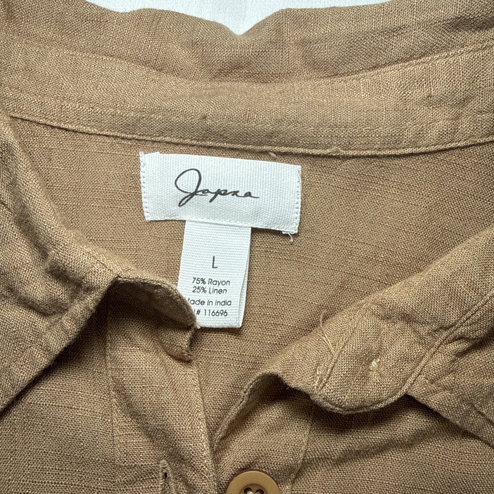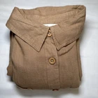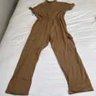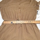 The Japna Women's L Short Sleeve Button Front Jumpsuit in Tan is a versatile and stylish one-piece outfit perfect for travel and casual occasions. Made from a comfortable linen blend fabric, this straight-leg jumpsuit features a collared neckline, button closure, and elastic waist for added comfort. With short cuffed sleeves and pockets for convenience, this jumpsuit is suitable for all seasons and comes in a solid brown color that fits seamlessly into any bohemian, coastal, or chic wardrobe. Easy to care for with machine washable instructions, this jumpsuit is a must-have for any fashion-forward woman. New with tags. See photos for measurements.