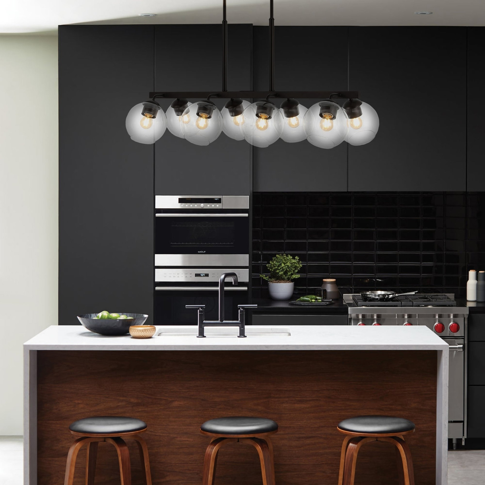 Perfectly sized for a kitchen island, small dining room, or over a desk, this 8-light pendant fixture features a linear arrangement of warm-toned Edison bulbs along a sleek metal frame. Vintage-inspired clear glass globes are perfect for your mid-century modern or contemporary kitchen, dining room, or home office.Features:Our mid-century style linear chandelier has Edison bulbs and clear globes with a vintage aged-bronze finishAdjustable-height pendant works best for ceilings up to twelve-feet highEight Edison bulbs create soft, warm lighting, while the clear glass globes add a mid-century touchTakes 8 bulbs and compatible with TYPE "A" 40W or CFL 13W or LED 9WColor: Oil Rubbed Bronze with clear shadeBody Material: MetalIncludes: One (1) lampAssembly RequiredDimensions:Lamp: 26.5-56.5 Free Shipping Over $49.99* Details Jaxon 33.5" 8-Light Farmhouse Bohemian Iron/Glass Linear LED Pendant, Oil Rubbed Product Description: Perfectly sized for a kitchen island, small dining room, or over a desk, this 8-light pendant fixture features a linear arrangement of warm-toned Edison bulbs along a sleek metal frame. Vintage-inspired clear glass globes are perfect for your mid-century modern or contemporary kitchen, dining room, or home office. Features: Our mid-century style linear chandelier has Edison bulbs and clear globes with a vintage aged-bronze finish Adjustable-height pendant works best for ceilings up to twelve-feet high Eight Edison bulbs create soft, warm lighting, while the clear glass globes add a mid-century touch Takes 8 bulbs and compatible with TYPE "A" 40W or CFL 13W or LED 9W ColorOil Rubbed Bronze with clear shade Body MaterialMetal IncludesOne (1) lamp Assembly Required Dimensions: Lamp26.5-56.5 inches high x 33.5 inches wide x 14 inches deep About us: You see a lamp. We see a decorative work of art. A perfectly curved shade casts a dramatic shadow on a floor. Compatible with LED lightbulbs as easy on the environment as they are on the eyes. The JONATHAN Y Lighting collection considers every detail from impeccably sourced materials to designer styling. And our prices are so attractive, we've transformed a functional necessity into a fashion accessory. JONATHAN Y Lighting - a fashion revolution in home decor.