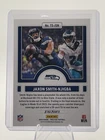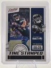 The product is a Jaxon Smith-Njigba 2024 Panini Prestige Time Stamped trading card featuring a red parallel variety with a limited print run of 399 copies. The card is in near mint or better condition and is an original Panini release. It is an insert card from the 2024 football season, specifically for the Seattle Seahawks team, showcasing the player's image and details on a unique time-stamped design.