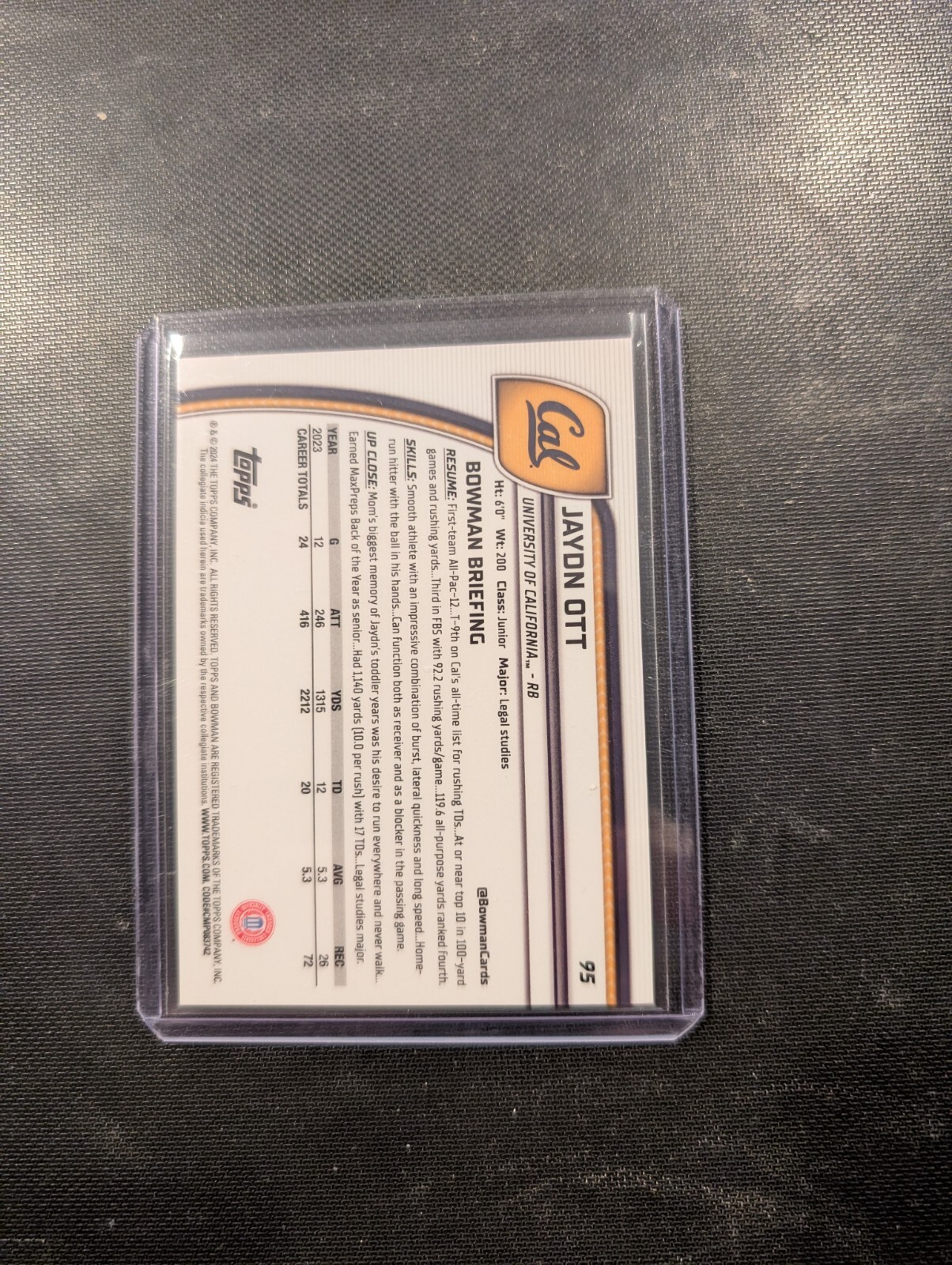 This rare and highly sought-after Jayden Ott 2024 Bowman Chrome U Sapphire Black sports trading card is a must-have for any football fan and collector. With a limited print run of just 10, this card features the California Golden Bears player in stunning detail, set against a sleek black background that showcases its premium quality. Part of the prestigious 2024 Bowman Sapphire Edition, this card is a parallel/variety piece that boasts exceptional craftsmanship and design. Whether you're a fan of the NCAA, a follower of Jayden Ott's rising career, or simply a connoisseur of fine sports memorabilia, this card is sure to be a standout addition to any collection.