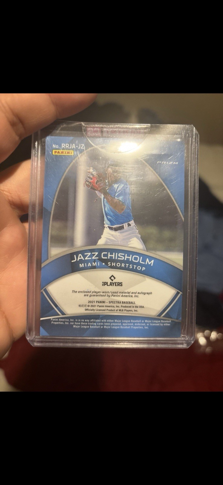 The product is a 2021 Panini Spectra Radiant Rookie Game Used Silver Triple Patch trading card featuring autograph of Jazz Chisholm, a player for the Miami Marlins. This card is a highly sought after Rookie Patch Autograph (RPA) card for baseball collectors. It is a premium sports trading card that includes three patches from game-used material, adding to its value and appeal among fans of the sport. With its unique features and limited availability, this card is a standout piece for any baseball card collection.