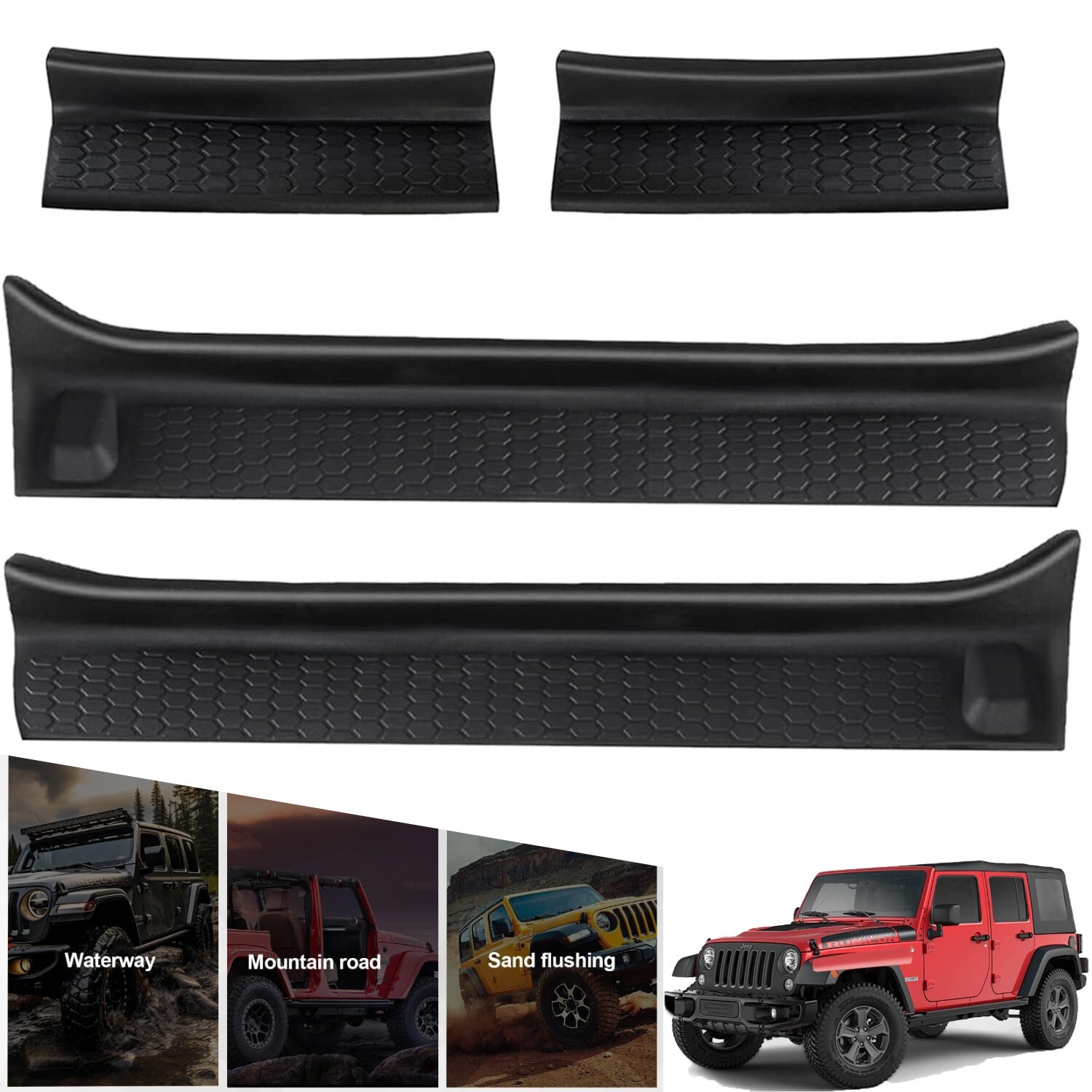 Fitment Fit for Jeep Wrangler JL JLU 2018-2024 Fit for Jeep Gladiator JT 4 Door 2020-2024 Features: 【APPLICATION】SUPAREE door sill guards kit fits for 2018 2019 2020 2021 2022 2023 2024 Jeep Wrangle JL JLU Gladiator JT 4 Door 【PROTECT YOUR DOOR SILLS】Door sill guards entry guards prevent the interior door sills from scratches, scuffs and other damage. And the door sill guards can cover up existing damage, which is a great decoration for the door sills 【HIGH QUALITY MATERIAL】The door sill guards protector fits gladiator that are made of black rubber, long-lasting and scratch resistant. Compared to the plastic, bendable rubber has better toughness and wear resistant 【EASY INSTALLATION】Our door sill guards have double-sided tape adhesives tape on the back, just stick them on the clean door sill directly. No cutting or drilling required. Quick installation within 5 minutes 【PACKAGE INCLUDED】2 pcs front door sill guards and 2 pcs rear door sill guards. Full 100% satisfaction AFTER-SALES included. If there are any issues, simply reach out to us. Get one risk free! 100% satisfaction aftersale services Specification Type: Car Door Sill Protector Material: High Quality Rubber Position:Front/Rear/Left/Light Color: Black Exterior:Textured Surface Long Strips Size: 24.8*3.54*2.75 inches Short Strips Size: 9.25*3.14*2.75 inches Package Included 2 x Front Door Sill Protector Cover 2 x Rear Door Sill Protector Cover Note: 1.Do not install it in rainy days.Ensure that the installation part is clean and dry. 2.In winter, you'd better heating the tape with a baking gun before sticking. 3.Reinforce it with a point tackifier or 3M double-sided adhesive will be better. 4.Within the required 2 hours before they achieve the best adhesion after the installation .