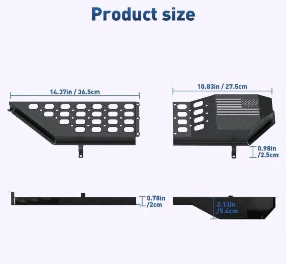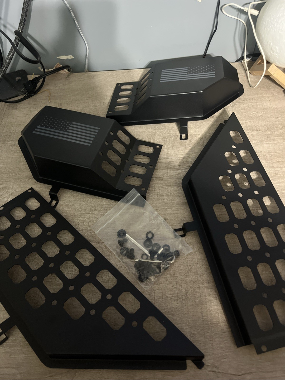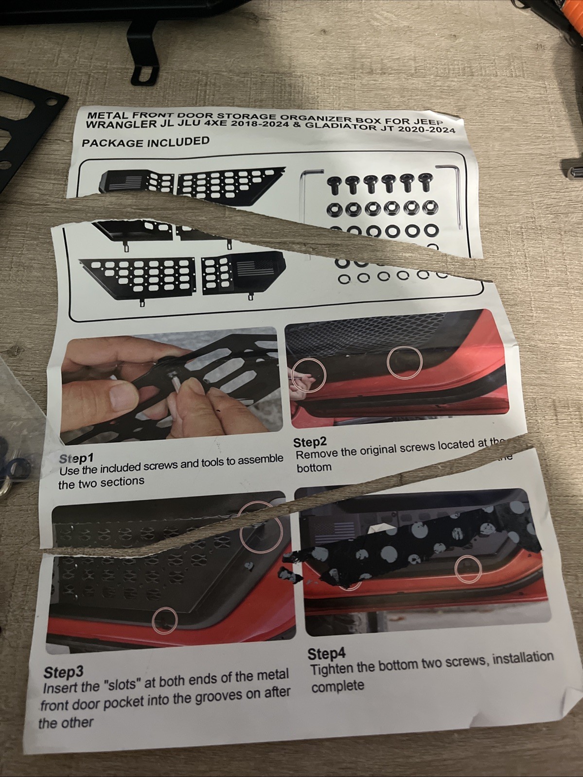 Perfect Fit】Metal Front Door Storage Box Pockets Fit for Jeep Wrangler compatible with Jeep Wrangler JL JLU 4XE 2018 - 2024 and 2020 - 2024 Gladiator JT 2/4 door.including Rubicon,Sport,Sahara,Moab Note: Not compatible with JK/JKU models ,rear doors or power seats. 🚗 instructions are torn but can still be easily read. 🚗【Metal Material】Crafted from high quality stainless steel, the door storage pockets is non-deforming, corrosion-resistant and impact-resistant.Perfectly compatible with Wrangler & Gladiator accessories 🚗【More Storage Space】Designed specifically for the Jeep Wrangler. The protruding front panel is perfect for water bottles or similar items, while other extra storage space keeps your sunglasses, cell phone, flashlight, lipstick, keys and other essentials neatly stored and easily accessible, making your vehicle's interior into a tidy haven. 🚗【Easy to install】Metal Front Door Pocket Storage Box for Jeep JL and Gladiator uses a secure screw installation instead of the unstable "snap-in" method. This ensures a strong hold, even on rough roads, and can be installed in minutes using the original door screws. No drilling required, providing a stable and durable solution. 🚗【Unique design】The JL door side insert organizer box for Jeep Wrangler incorporates elements of the Star.Provide a clean and attractive interior, and the black finish gives it an added sense of sophistication that merges well with the cabin