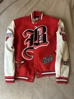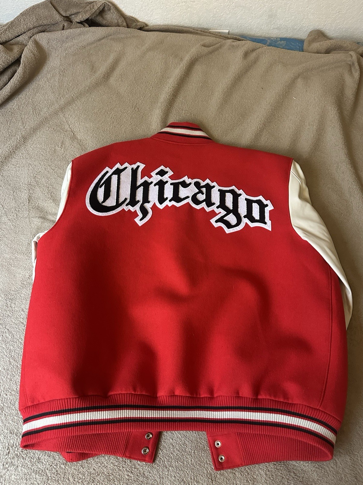 The Jeff Hamilton Chicago Bulls Men's Leather Varsity Jacket is a brand new stylish piece in size large, perfect for casual occasions during the winter season. Made from high-quality leather with a solid multicolor design, this jacket exudes a varsity style that is both classic and on-trend. Handmade in the United States and featuring a dry clean only care instruction, this jacket is a must-have for any man looking to add a touch of sophistication to their wardrobe.