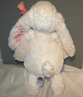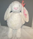 Jellycat RABBIT BUNNY Embroidered KAYTLIN Plush 15" Stuffed Animal Toy Soft Security bunny Measures 15" when stretched flat Sits 11" high Ears measure 7-3/4" long and has an attached pink lime dotted ribbon bow Arms are 6" long Color is a light cream Pink fabric nose Black plastic eyes Material is polyester fiber and plastic pellets Made in China Would be considered pre-owned, but is in like-new condition. •♦•