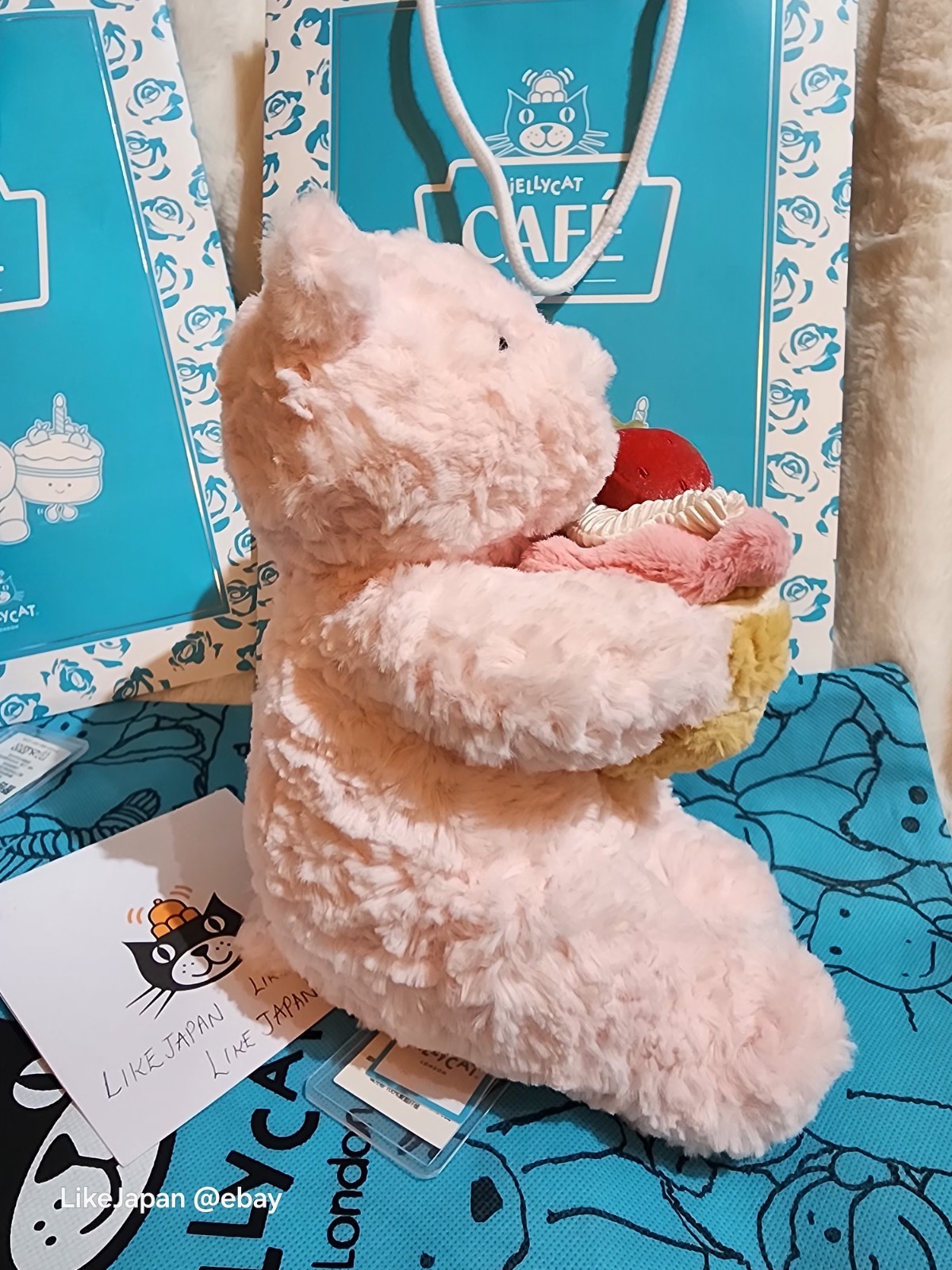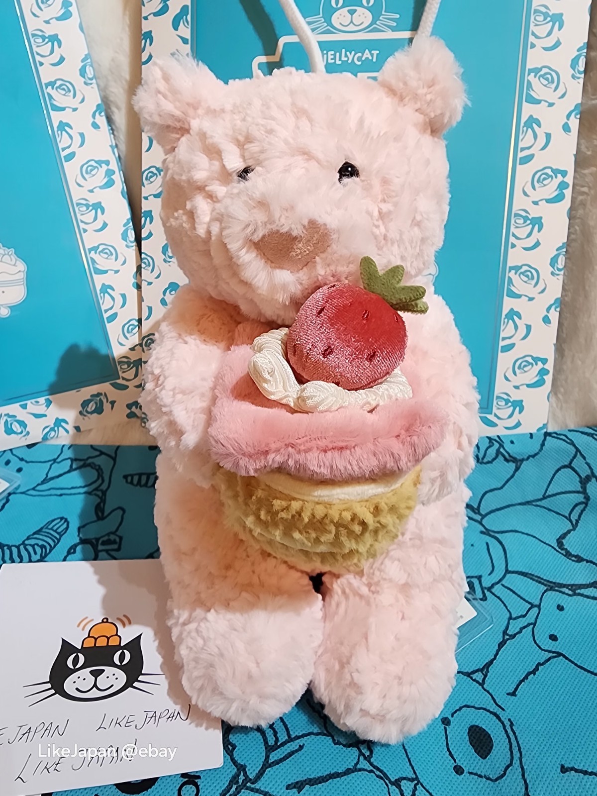 The Jellycat Amusable Shanghai Cafe Bundle featuring Leola Bear holding a strawberry cake is a retired soft toy set perfect for collectors and fans of the brand. This exclusive item, inspired by the Shanghai cafe theme, is made of plush material in a lovely pink colour. Ideal for adults aged 17 years and up, this modern soft toy from Vietnam is a charming addition to any toy collection or display.
