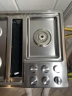 This cooktop is in excellent condition, it is missing 1 burnercap, but the replacement burner cap has been ordered. Experience the elegance and efficiency of the Jenn-Air 36" EuroStyle Gas Downdraft Cooktop, designed to be a focal point in any kitchen. With its sleek stainless steel construction, this cooktop is not only visually stunning but also durable. The drop-in installation ensures a seamless fit for quick and easy setup.