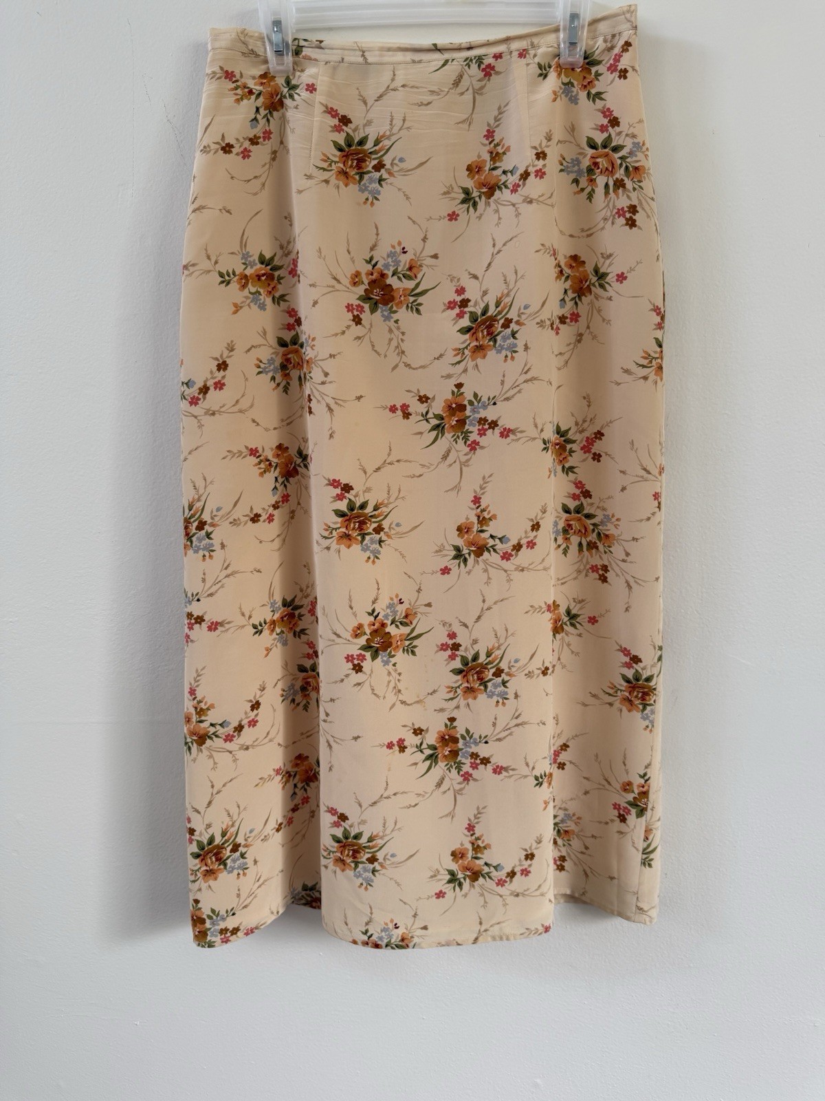 The Jennifer Moore Women's Beige Silk Floral Lined slit Skirt in size 10 is a stylish and versatile piece perfect for various occasions such as parties, casual outings, workwear, and business meetings. Made from luxurious silk, this long skirt features a beautiful floral pattern with a zip closure for easy wear. The lightweight design and mid-rise waist make it comfortable for all-day wear, while the lined interior adds an extra touch of sophistication. This chic skirt is ideal for the summer, fall, and spring seasons, adding a touch of elegance to any wardrobe. Condition of the skirt is Pre-Owned in great shape! Shipped asap by USPS ground advantage mail.