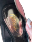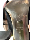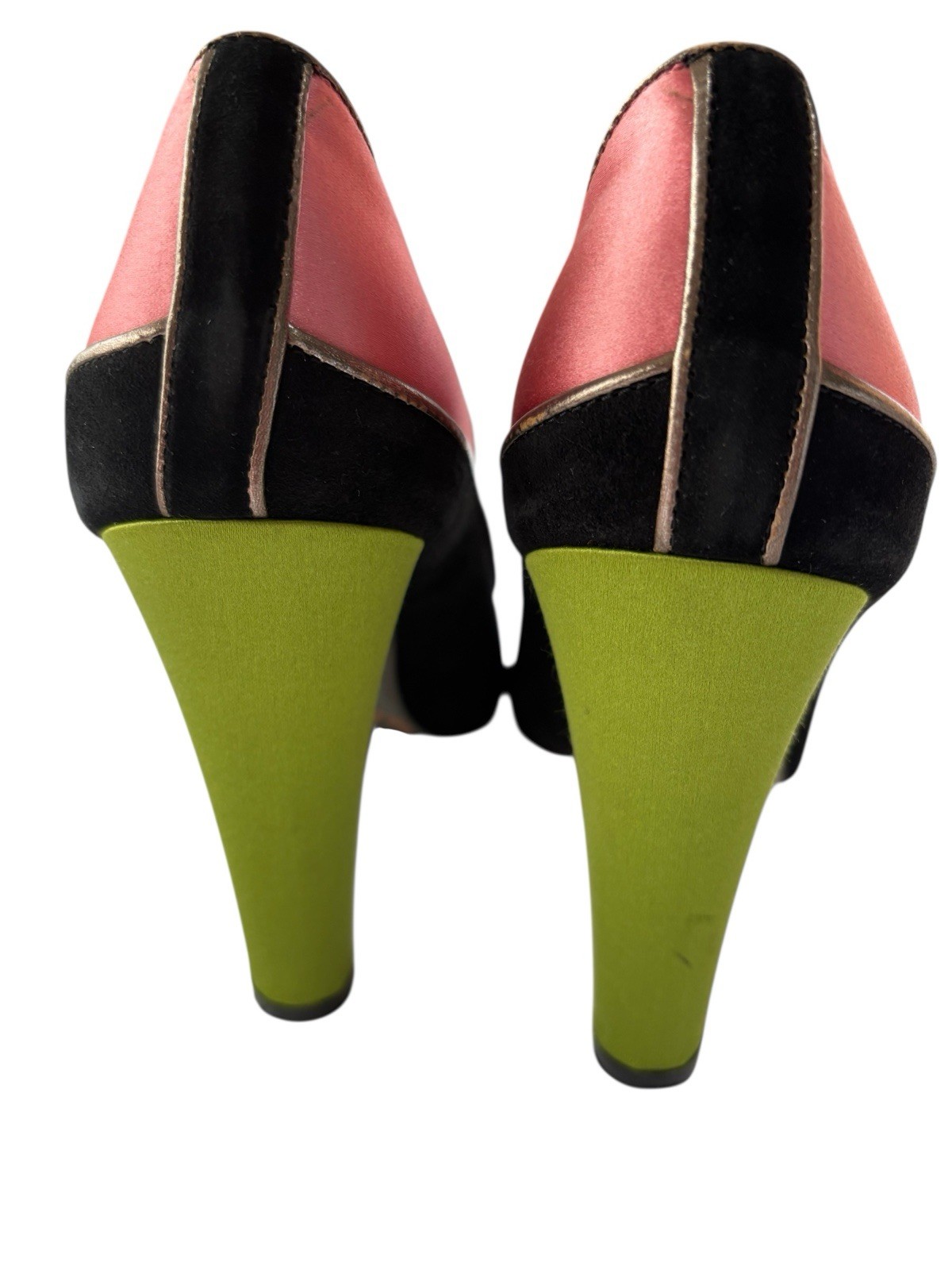 These Jerome C Rousseau designer women's pumps are a stylish and unique addition to any wardrobe. Made in Italy with a retro colorblock pattern, these pumps feature an almond toe shape and a high block heel for added sophistication. The multicolor satin design and leather upper material make these pumps a versatile and fashionable choice for any occasion. Perfect for those who appreciate both quality and style in their footwear, these pumps are a perfect fit for those looking for a standout pair of heels in a US shoe size 6.5. Very good condition, minor front sole wear Heel height: 3”