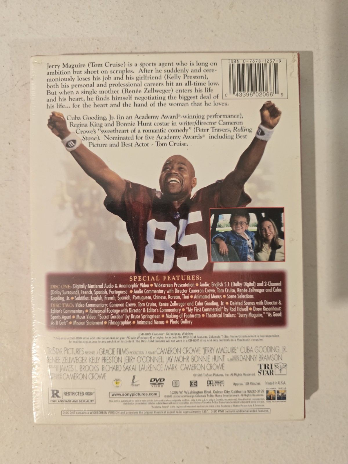 Jerry Maguire (Tom Cruise), a slick, high-living sports agent, is tired of the shallowness of his profession and wants to live a more fulfilling, ethical life. But Jerry's new outlook doesn't mesh with his agency's ethics, and he is promptly fired. Jerry finds himself left with one ally, one client, and a long road ahead of him. Along the way he finds something more important than money--love. Cruise, Cuba Gooding, Jr., and Renée Zellweger turn in outstanding performances in this romantic comedy written and directed by Cameron Crowe (SAY ANYTHING, SINGLES).